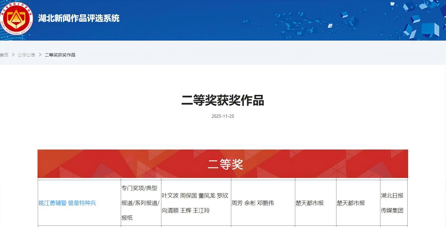 11月25日,湖北传媒网发布《关于公布2023-2024年度湖北优秀新闻作品征集评选结果的公告》。其中,楚天都市报新闻、硚口公安《跳江勇辅警 曾是特种兵》新闻报道,荣获湖北优秀新闻作品二等奖。