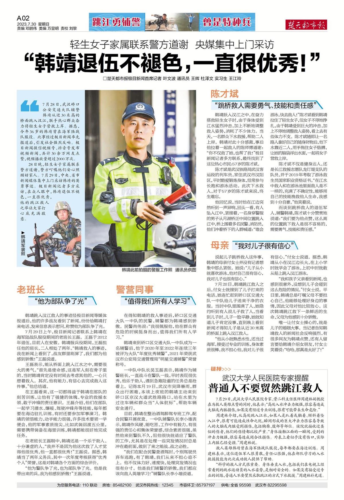 楚天都市报新闻记者从警方获悉这一线索,立即奔赴月湖桥实地采访,得知救人英雄、辅警韩靖曾是一名海军陆战队的特种兵。报社全网率先推出《跳江勇辅警 曾是特种兵》新闻报道。
