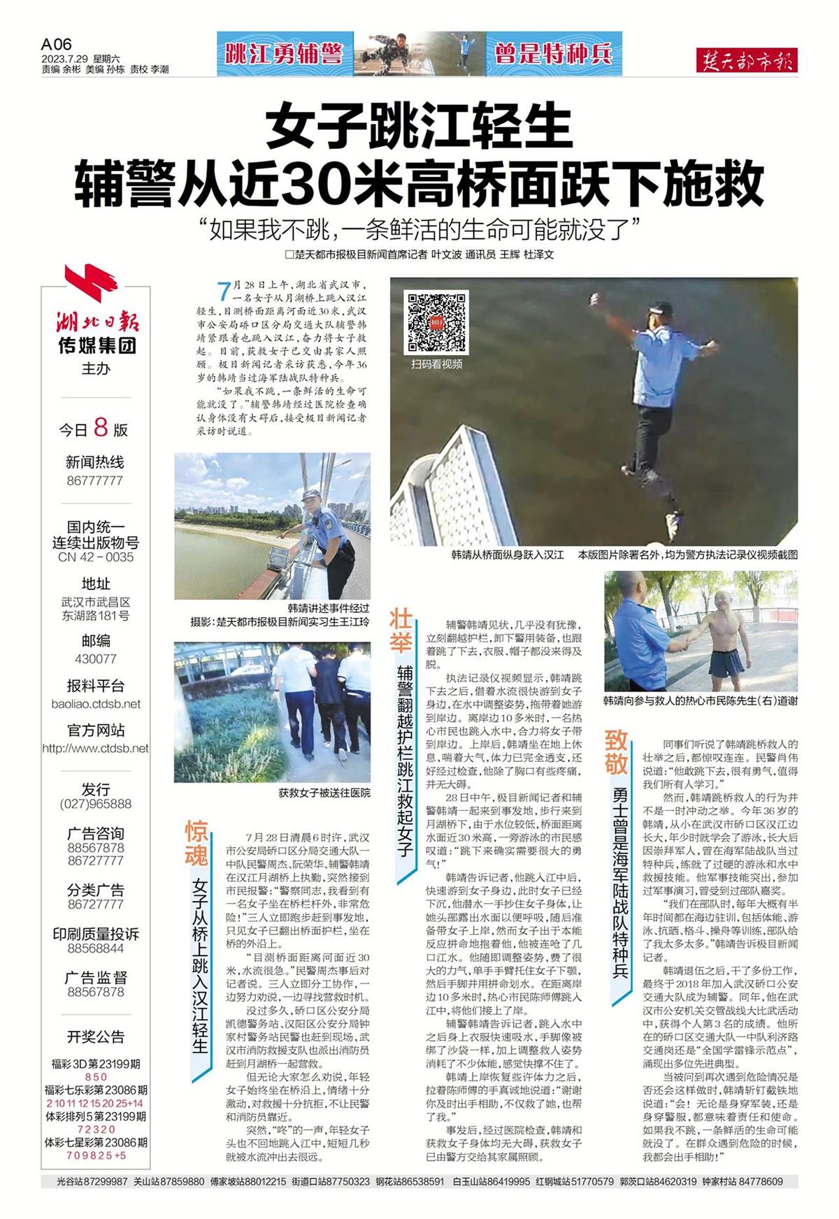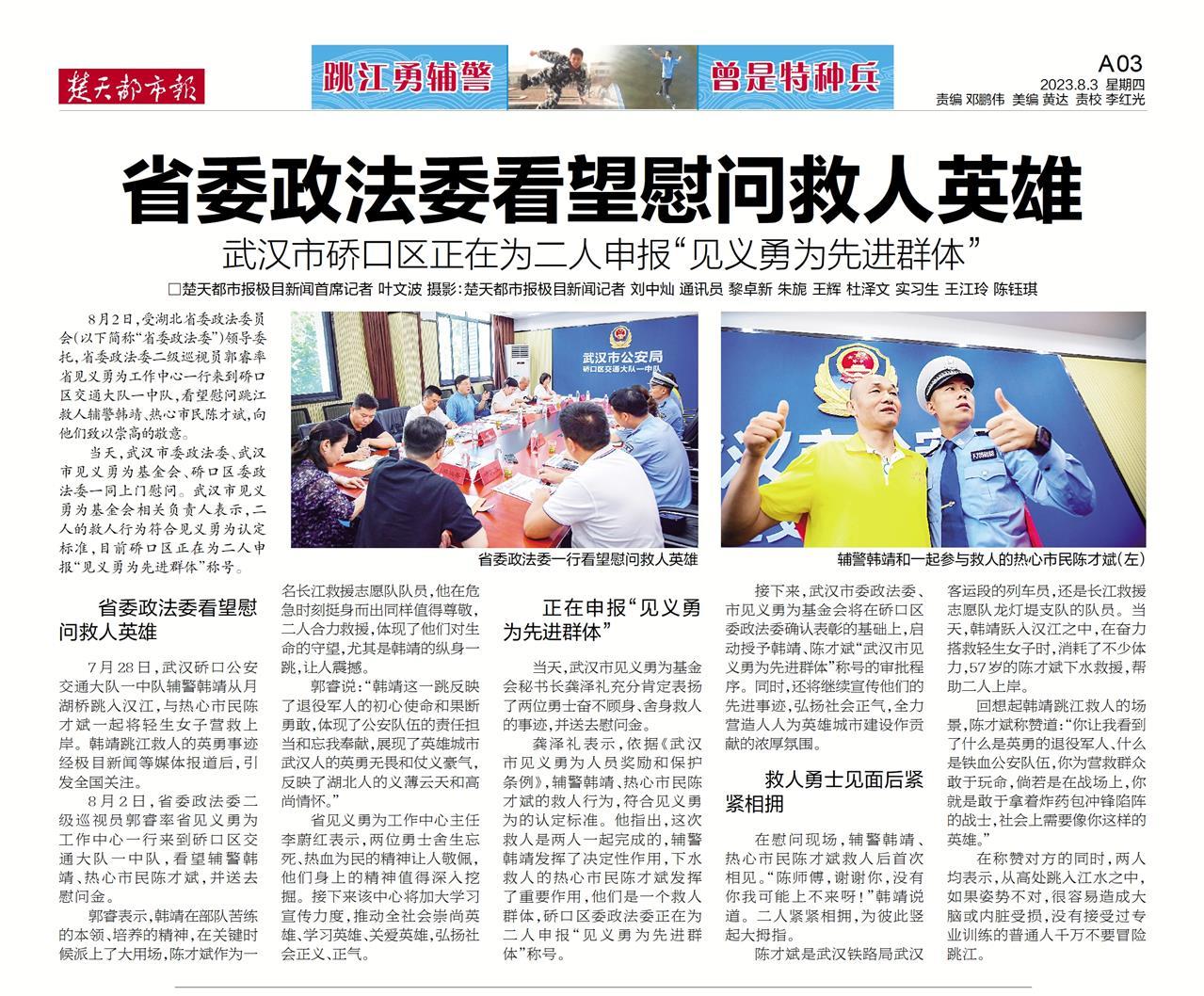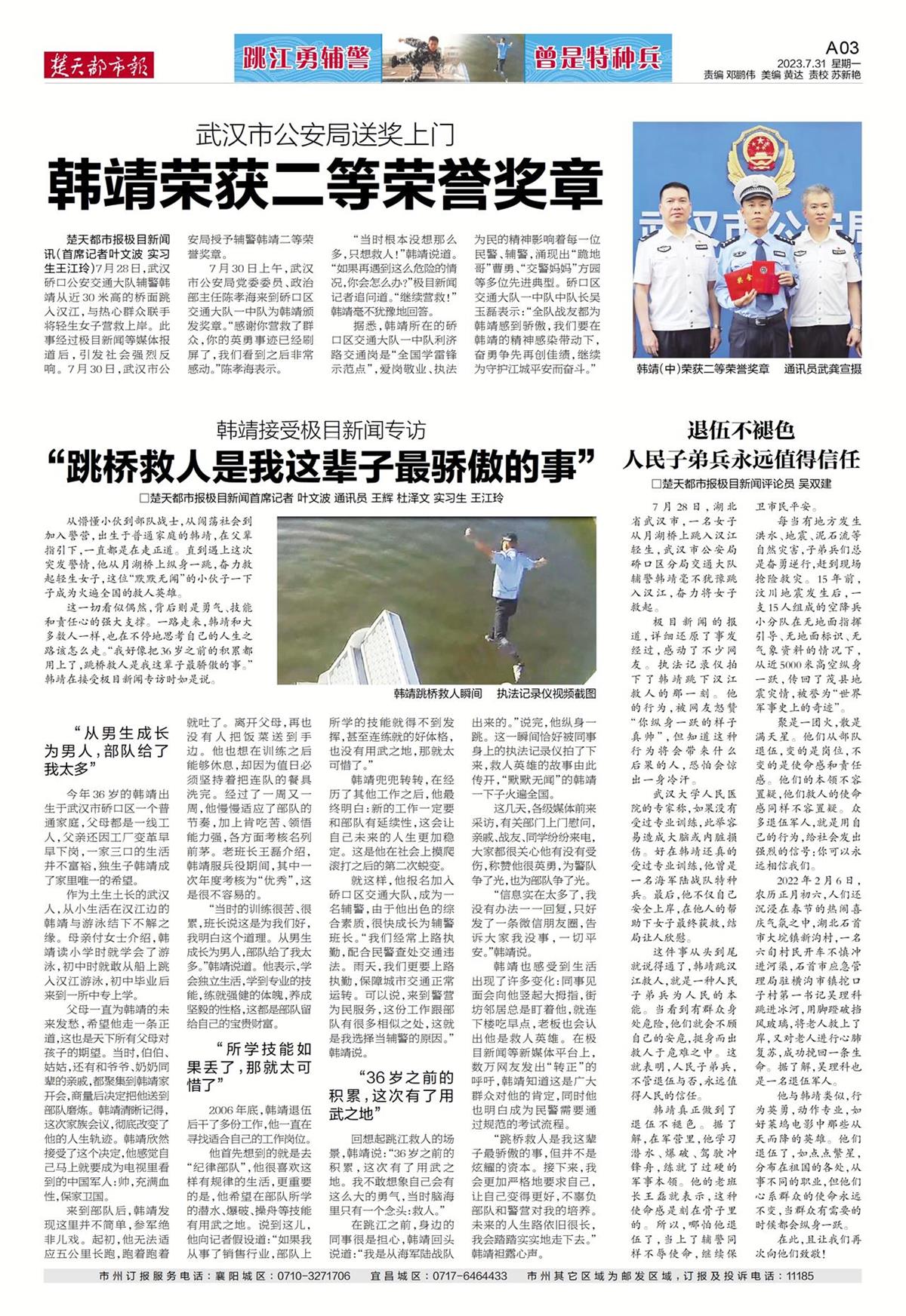 2023年7月28日,一名女子从武汉市月湖桥跳江轻生,在此执勤的硚口区交通大队辅警韩靖直接从月湖桥跳入汉江,与在江边游泳的热心市民陈才斌一起成功救起轻生女子。