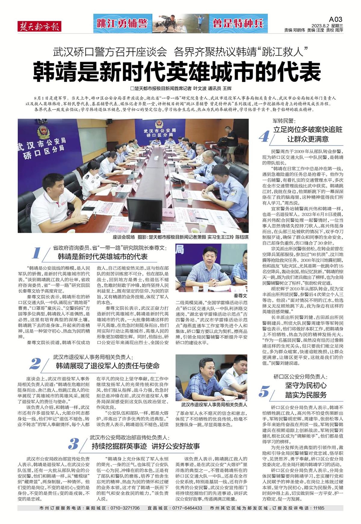 2023年8月1日建军节当天,社会各界齐聚硚口区公安分局召开座谈会,并发出倡议:学习韩靖退伍不褪色、坚守初心的坚定信念,学习他舍生忘死、热血为民的奉献精神,学习他苦干实干、勤于钻研的敬业精神。
