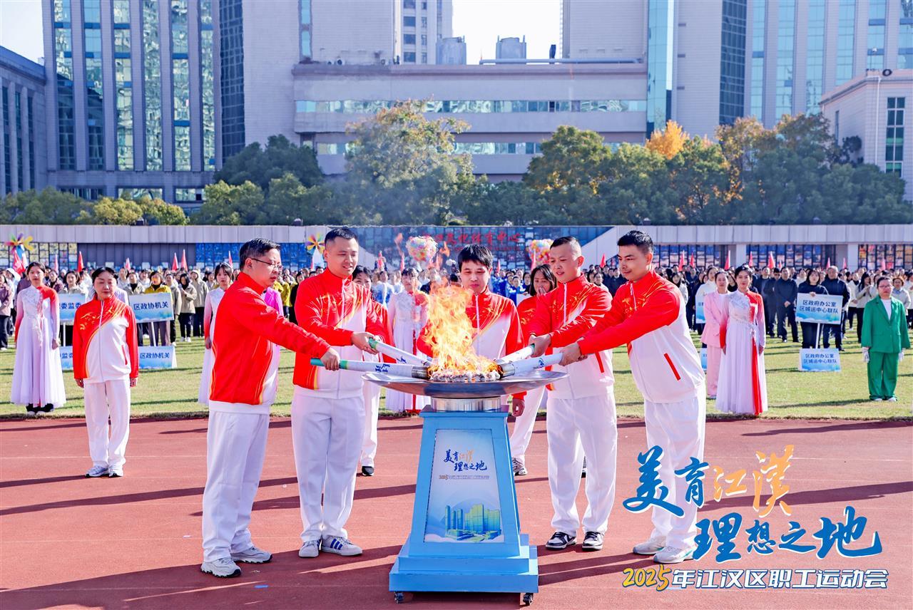 现场,“新兴之火”“数智之火”“金融之火”“枢纽之火”“人文之火”五棒火炬依次点亮,张裕、付俊、邵青、张宝剑、孟广松等15位劳模代表接力传递。燃烧的火焰,照耀着江汉区在科技创新、数字化转型、金融强区、商贸物流、文商体旅融合等发展领域坚定向前。当所有火炬手共同点燃主圣火盆时,彩球腾空,全场沸腾,运动会正式开幕。