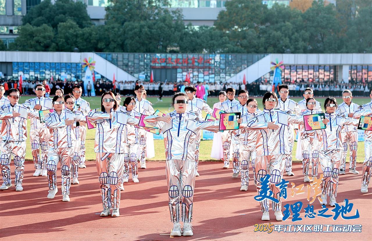本届江汉区职工运动会,73家单位组成59支队伍,伴随着激昂的运动员进行曲,五大特色方阵率先登场。红色领航方阵高举信仰之旗,彰显江汉干部职工在党的引领下凝心聚力、共谋发展;金融强区方阵踏出资本市场的节奏与力量,谱写“千亿基金,助力江汉”的现实图景;数字融合方阵身着银色未来装,手持平板佩戴AR眼镜,演绎“智转数改”的科技动能;文旅消费活力方阵舞出都市商圈的热闹繁华、文旅街区的独特韵味与街头巷尾的袅袅烟火;现代商贸方阵全员身着蓝色工装,通过舞剧展现拼搏实干的江汉物流人建设商贸物流核心区的决心与奋斗力量!其余各代表队也迈着矫健的步伐整齐入场,或用精编节目博得喝彩,或以嘹亮口号响彻会场。