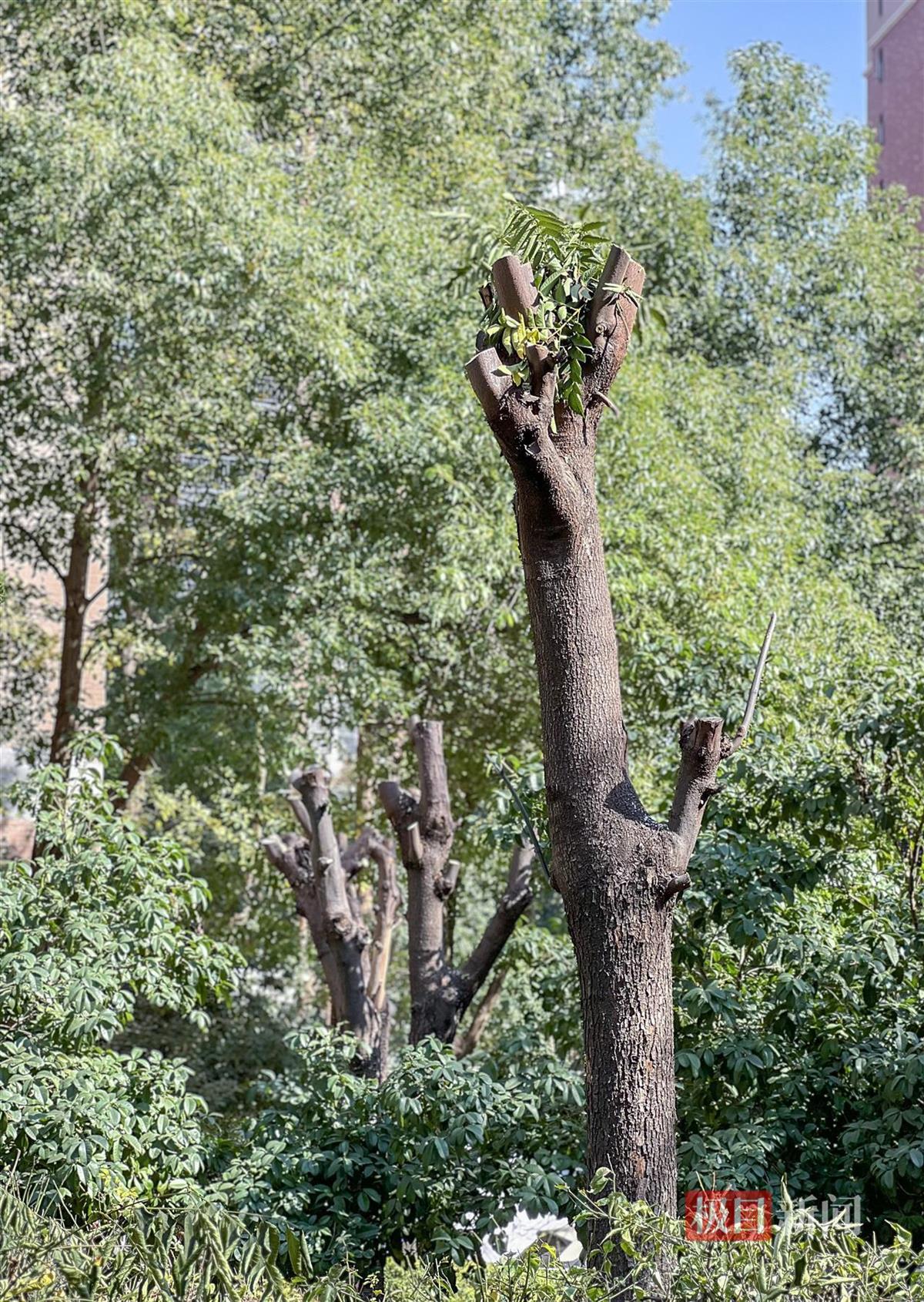 当日下午,记者在该小区C4栋周围看到,3棵梧桐树、8棵栾树、6棵樟树共17棵树木均被大幅修剪,树干直径多在20厘米左右,部分树木已长成参天大树,锯下的枝叶仍有少部分还未来得及清理。“这些树长了十几年才枝繁叶茂,夏天能遮阴降温,现在被砍得只剩树干,太可惜了!”吴先生无奈地说,如此修剪不仅破坏了小区景观,还让夏日的小区失去了遮阳屏障。