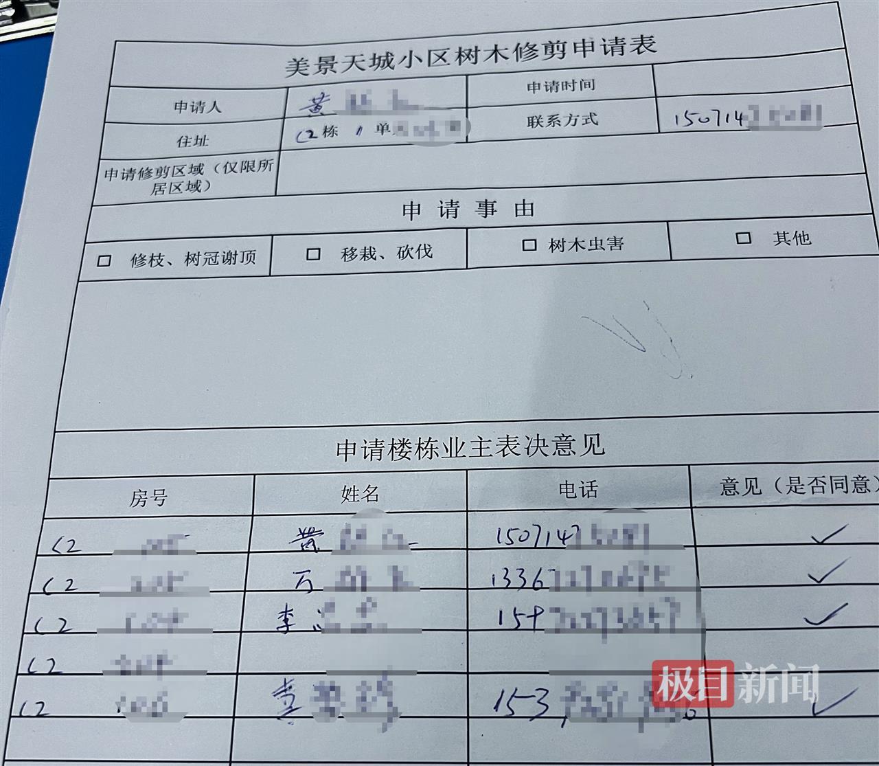 针对居民质疑,美景物业服务中心蒋姓工作人员表示,近期修剪的树木多是因低层住户反映树枝遮挡采光,主动向物业申请处理的。她向记者出示了两份“美景天城小区树木修剪申请表”,表中显示有7名业主明确要求修剪楼边树木。“有的业主觉得树枝挡了光,有的业主担心树木因刮大风导致玻璃受损,众口难调,我们也很为难。”蒋女士表示,物业考虑到业主的实际需求,才对树木进行了修剪。