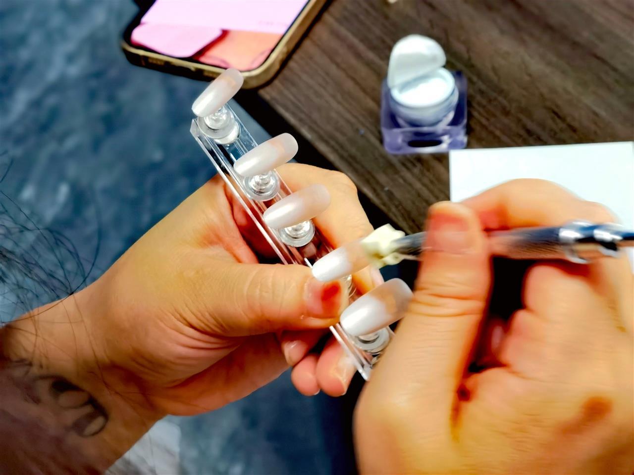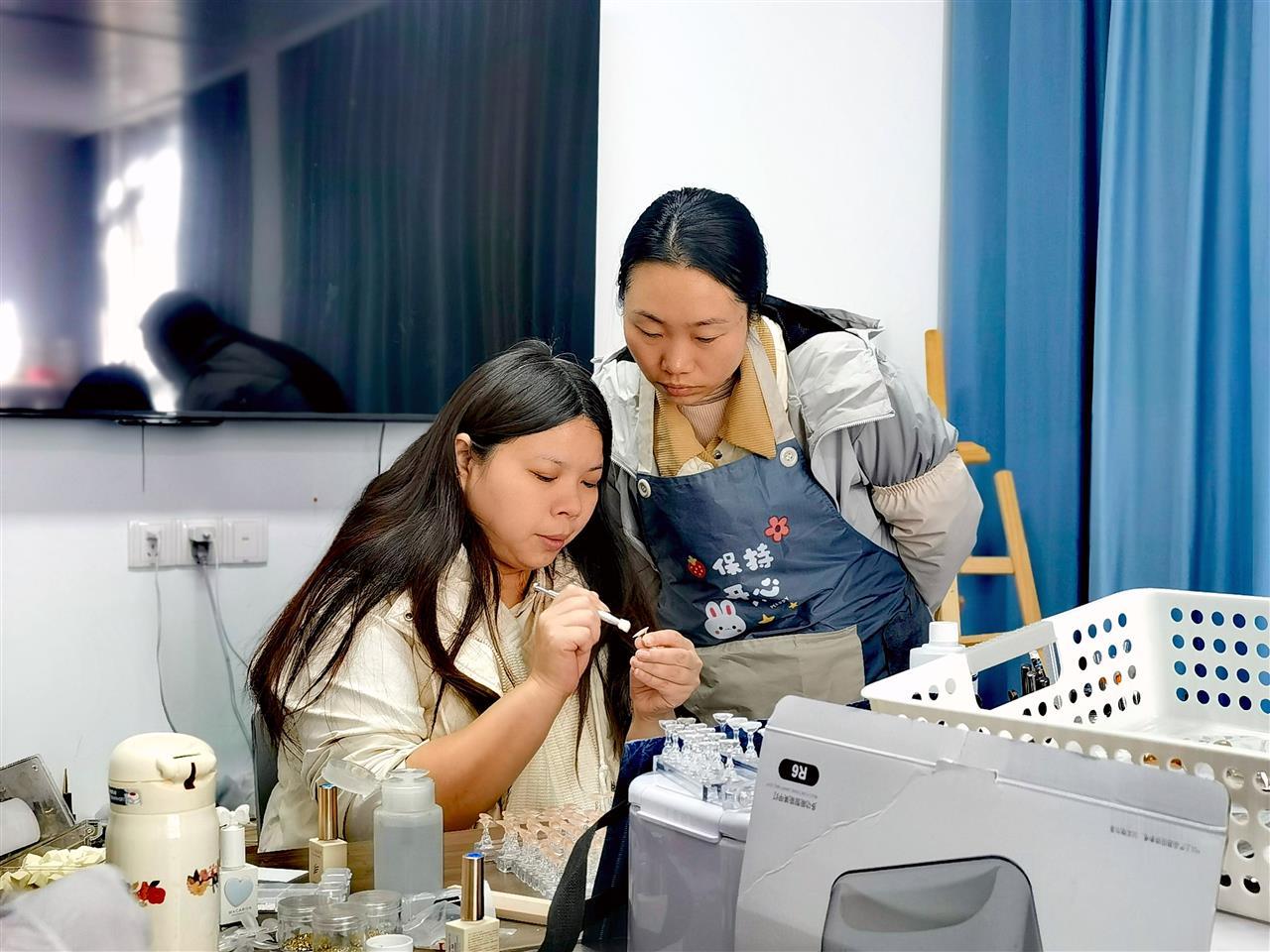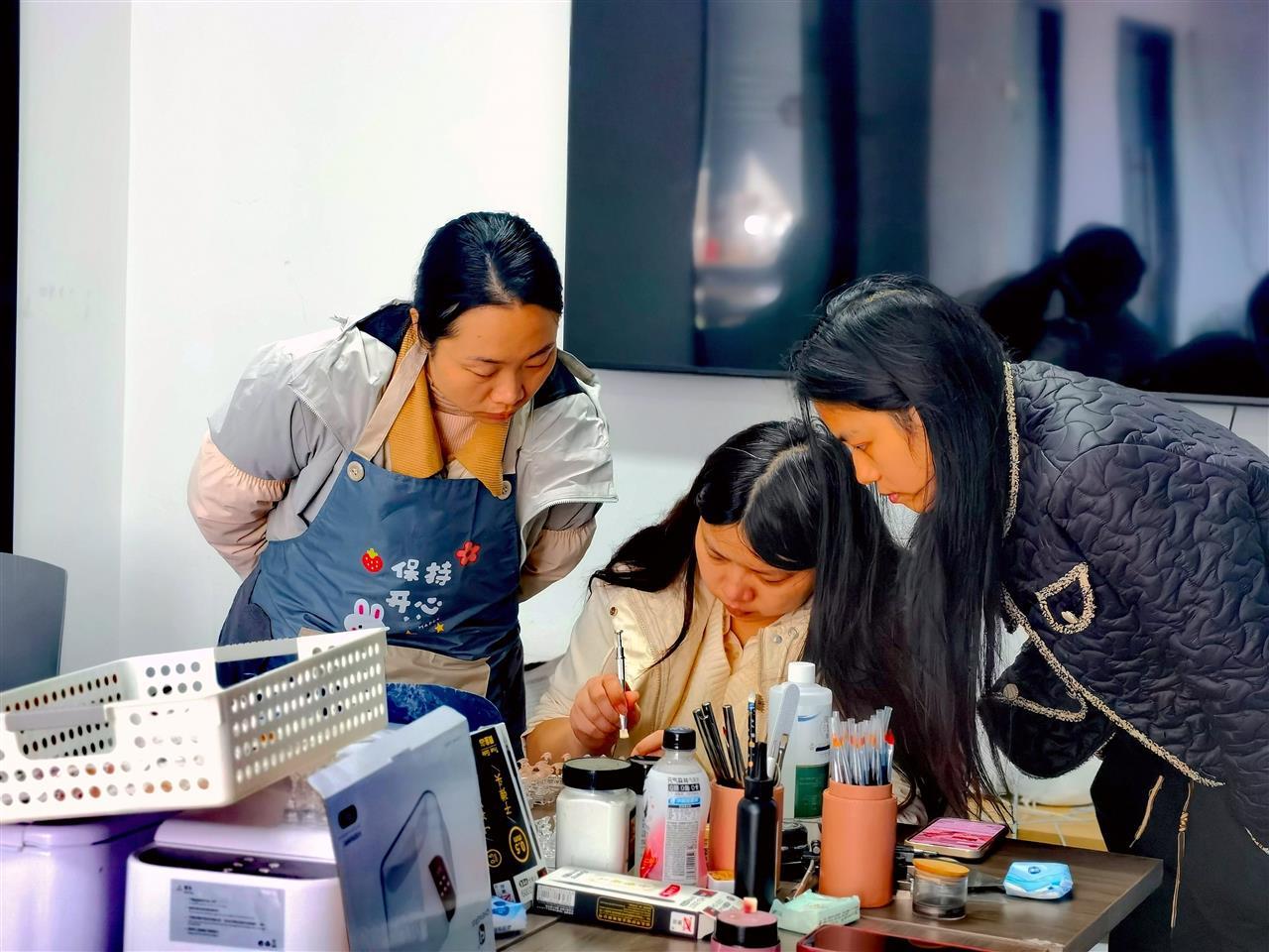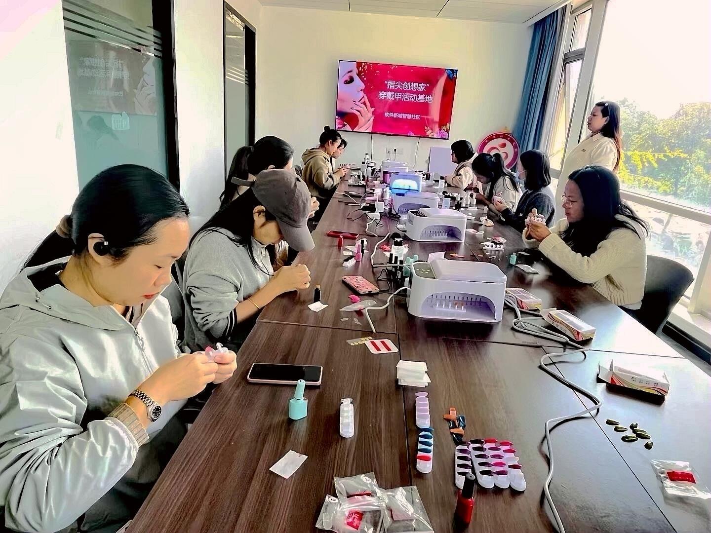“大家上手很快,法式、雕花、喷枪这些环节都能掌握。”陈露是这个穿戴甲培训班里成长起来的居民老师,她以前做过美甲类工作,上过班也摆过摊,因为家庭变化中途放弃了这一行,这次她重新找到了发光的地方,既能和志同道合的人一起做喜欢的事情,还能变现。