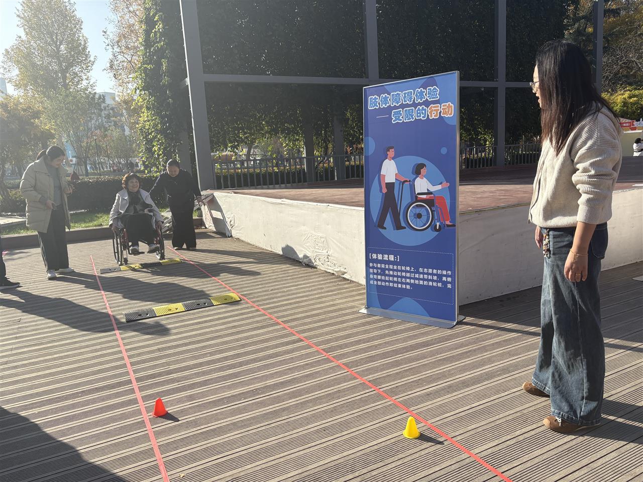 “受限的行动”体验区,体验者坐在轮椅上完成过斜坡、俯身拾物等任务。“平时弯腰捡东西不过一秒钟的事,坐在轮椅上却要费好大劲。”市民王先生擦着汗说,“以前觉得无障碍设施是‘加分项’,现在才明白是‘必需品’。”