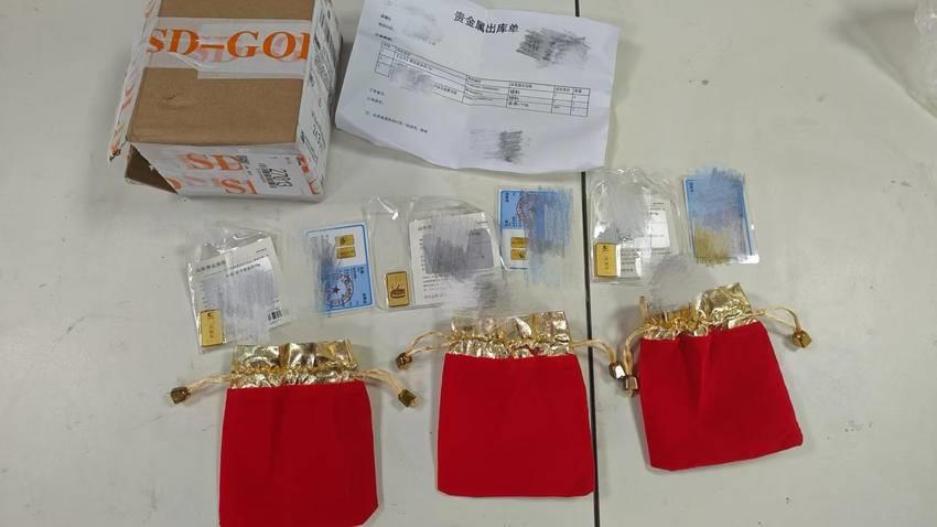 同一时间,在安山某快递点,接到义警快递员线索的民警依法开箱查验,只见红色包装袋中,整齐排列着一块块小金条。