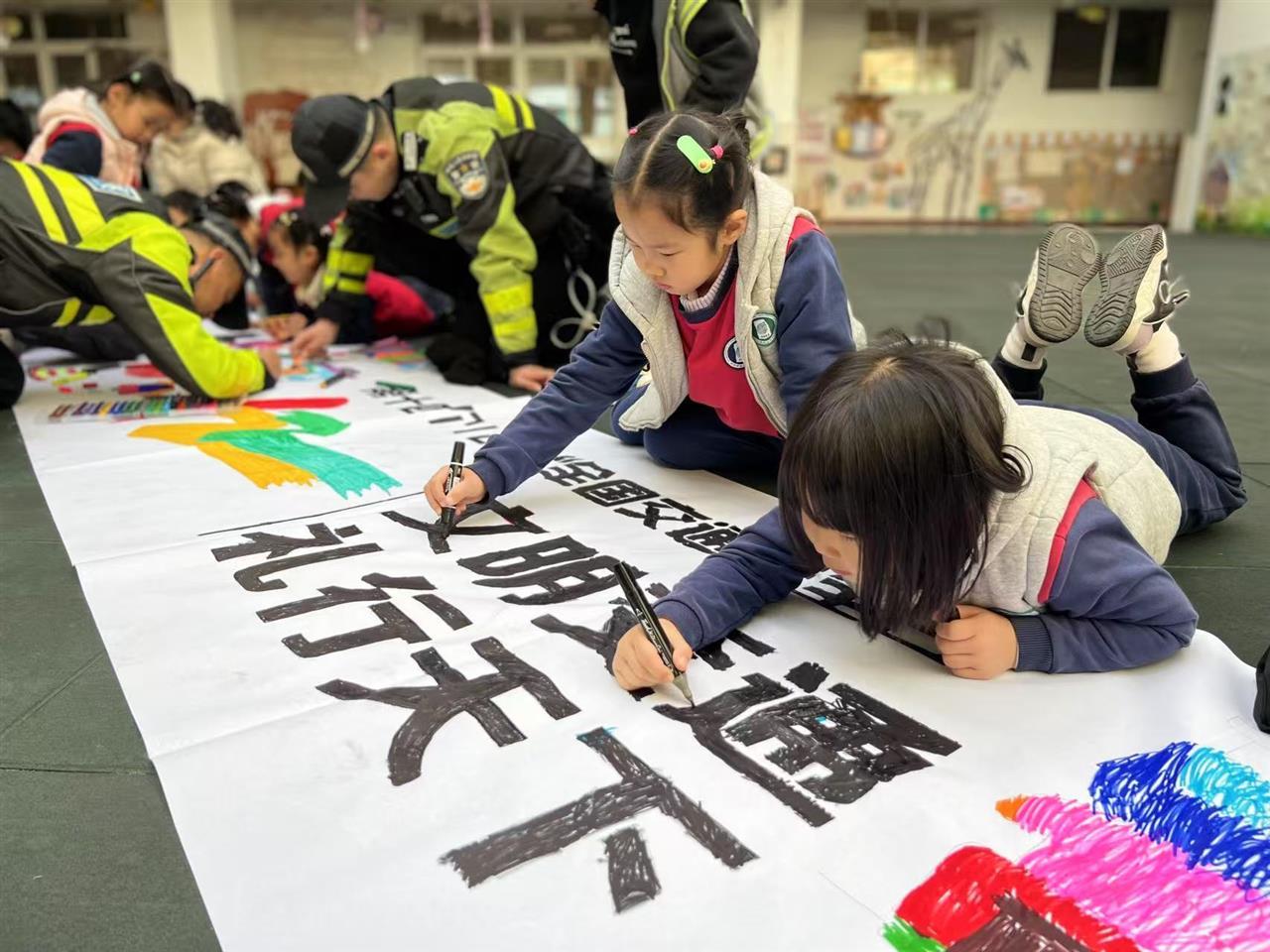 随后,幼儿园室内操场上,十米长卷铺开。教学园长严晓红带领孩子们与交警叔叔共同绘制了122交通安全主题长卷,为画卷增添了亮丽的颜色。一幅幅色彩鲜艳、形象生动的作品,每一幅都描绘出对文明交通的美好愿景。