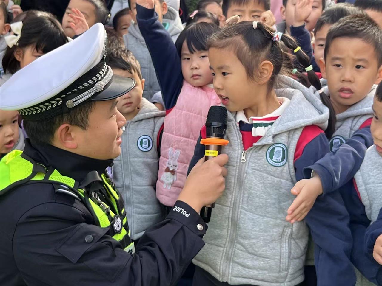 活动现场,民警结合园区周边道路特点和幼儿认知规律,通过交通标志辨认、趣味问答、吟唱童谣、交通手势模拟等形式,讲解了安全过街、识别交通信号灯、车辆盲区避险、不在马路上追逐打闹等实用知识。孩子们在“红灯停绿灯行”“大手拉小手”等互动游戏中,逐步建立起安全文明出行意识。