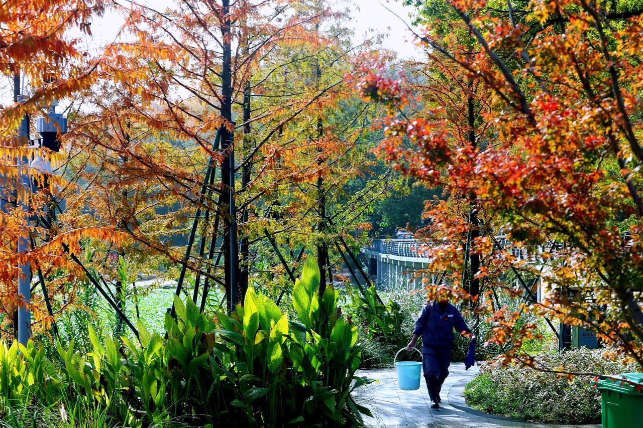 满径梧桐黄,是初冬的东湖南路写给东湖的情诗;一路保洁忙,是城市管理者对湖光山色的呵护。