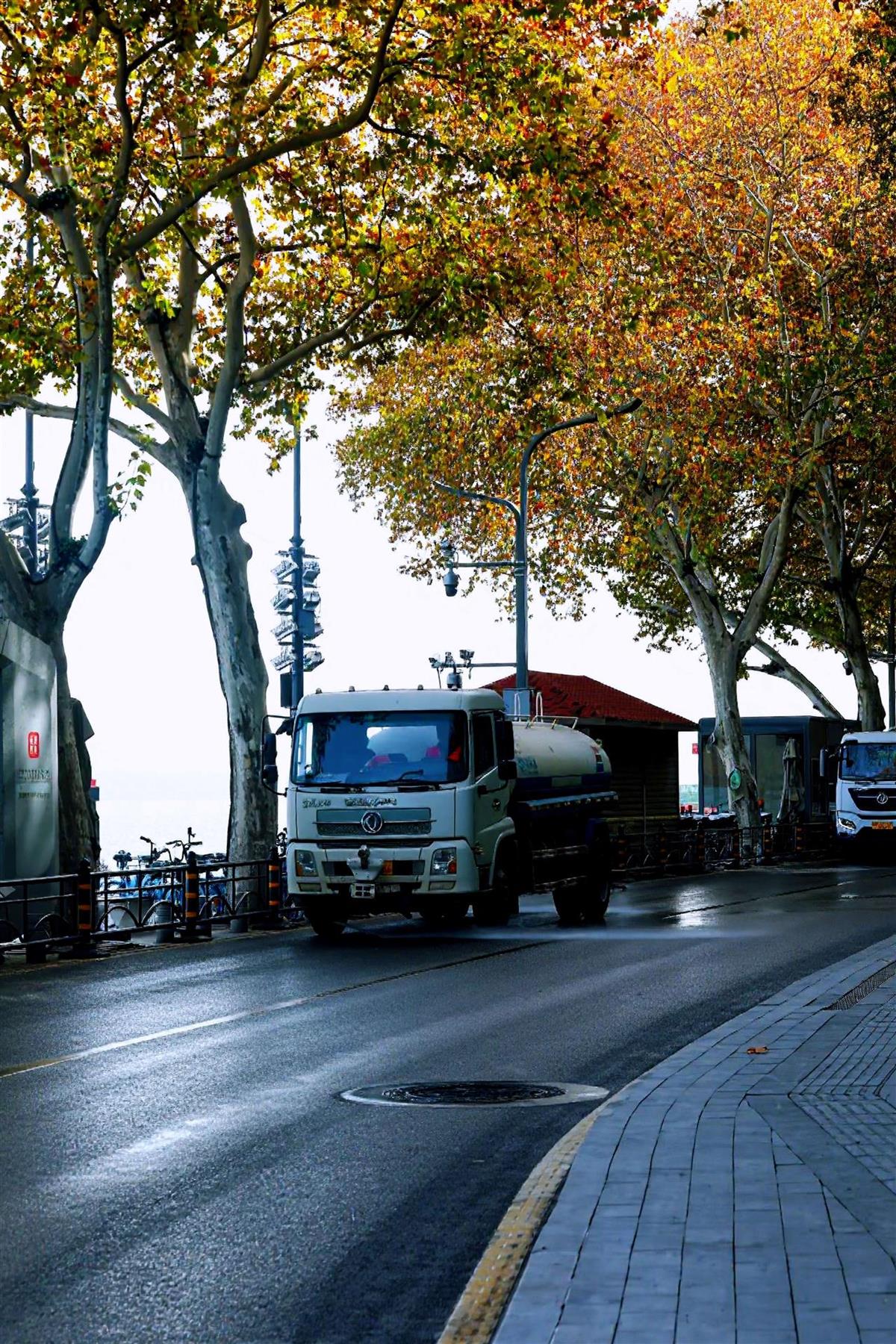 当东湖还在夜色中轻漾时,凌晨五点的东湖南路上就已经出现了洒水车和清扫车的身影。水流轻拂路面,将落叶冲刷到道路一侧(见下图),避免早高峰的车辆将树叶压碎,这是第一道工序。清扫车紧随其后,进行天亮前的一轮“普扫”。双向仅两车道的东湖南路车行道,自此之后便路见本色,清洁如新,准备迎接东湖日出。