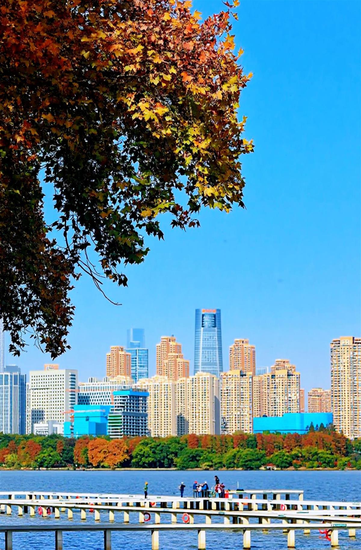 此时的清漂船上的那两点“橙”,或许并不知道,他们不仅在用行动兑现“水清岸洁”的承诺,也与湖光山色、彩叶满岸,共同构成了初冬东湖的如画风景(见下图)。