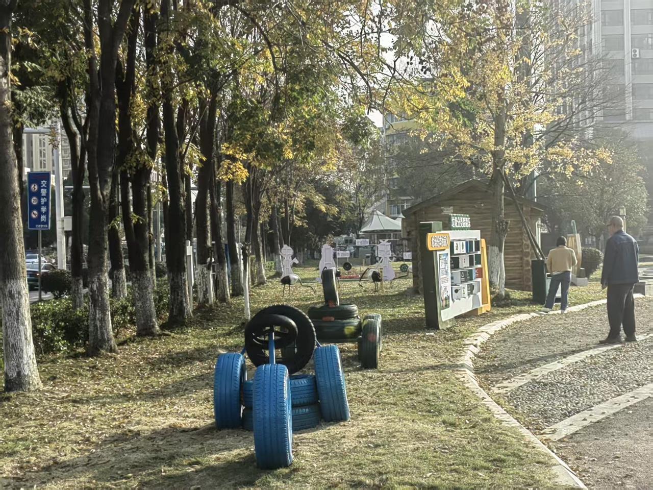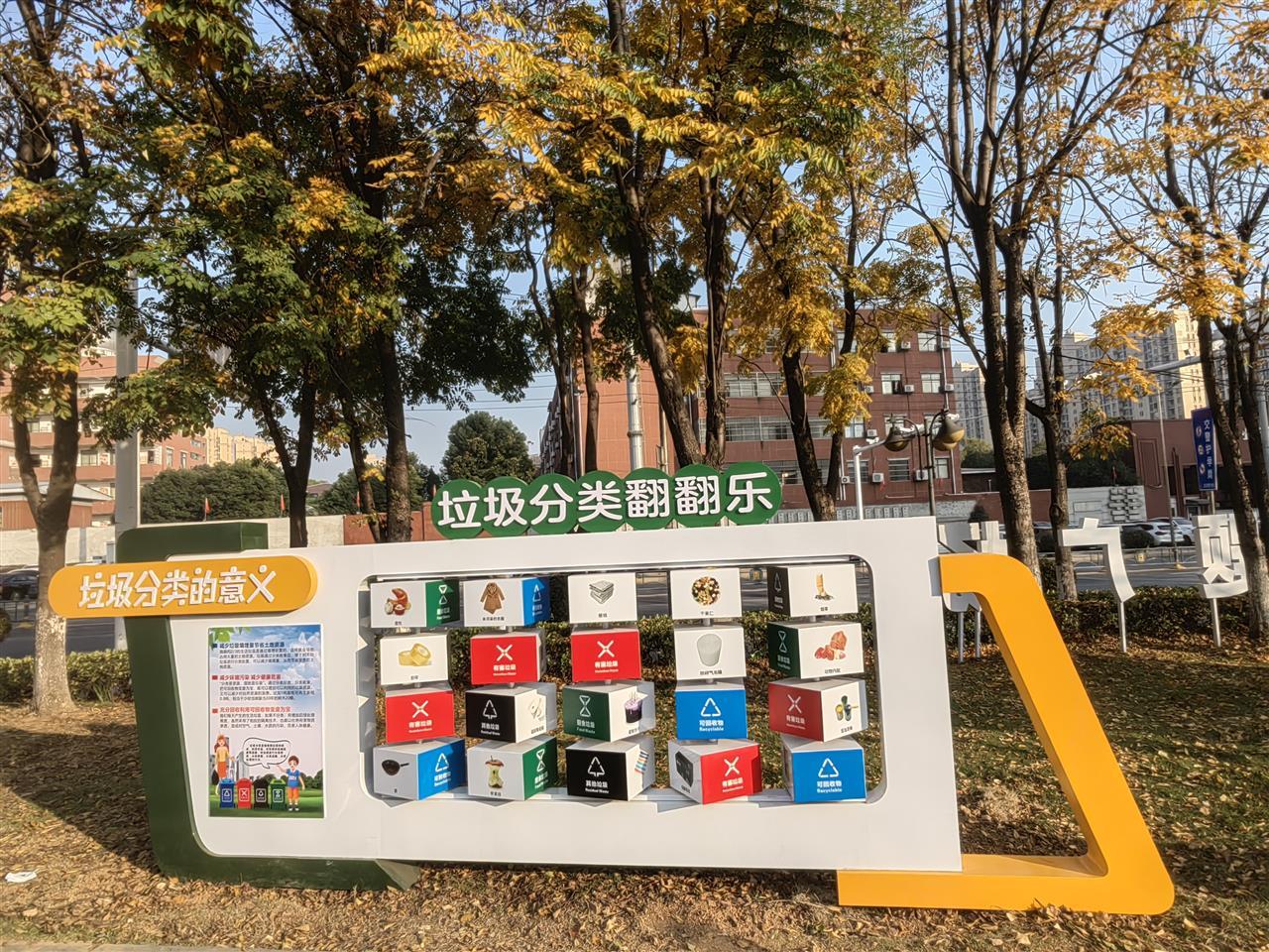 两座主题公园虽风格迥异,却同样以环保创意书写城市治理新篇章。庙山园区的李时珍垃圾分类主题广场地处核心地段,串联起周边社区、学校与商圈,以“环保再生、趣味互动、生态融合”为核心理念,彻底打破传统环保宣传的单向说教模式。远眺而去,环保再生材料打造的彩色立体景观字醒目矗立,成为广场标志性打卡点;四色彩绘步道精准对应不同垃圾类别,市民信步其间便能直观掌握分类标准;独具匠心的“垃圾分类千年图鉴”,以废旧钢管、轮胎为原料,生动再现古今垃圾处理的演进历程,为环保主题注入深厚文化底蕴。园内的“翻翻乐”互动装置与分类导视牌清晰传递分类规则,经艺术化改造的废旧轮胎化身丹顶鹤雕塑、休闲桌椅及国风打卡造型,让废弃物重获生命力,实现“可看、可触、可玩、可学”的沉浸式环保体验。