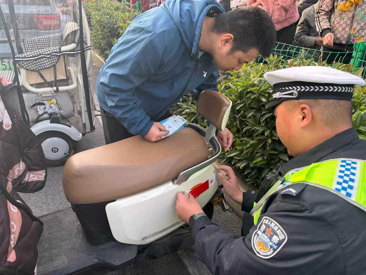 校园安全是交通安全宣传的重点领域。12月1日下午,四中队精准把握实验小学熊廷弼校区放学高峰时段,在校门口为家长和学生“送安全”:“家长您好,给您的电动自行车张贴反光标贴,晚上放学路上光线暗,贴上更醒目也更安全。”