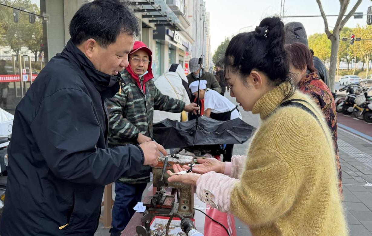 活动现场热闹非凡,围绕居民日常生活需求设置的服务区域井然有序。磨刀师傅手持砂轮,将锈迹斑斑的刀具打磨得锋利如新;修伞志愿者仔细拆解损坏部件,巧手修复让旧伞重获“新生”;理发区里,理发师根据居民喜好修剪发型,清爽造型让老人们笑容满面;配钥匙摊位前,师傅精准测量、快速切割,为居民解决“钥匙难配”的小烦恼。