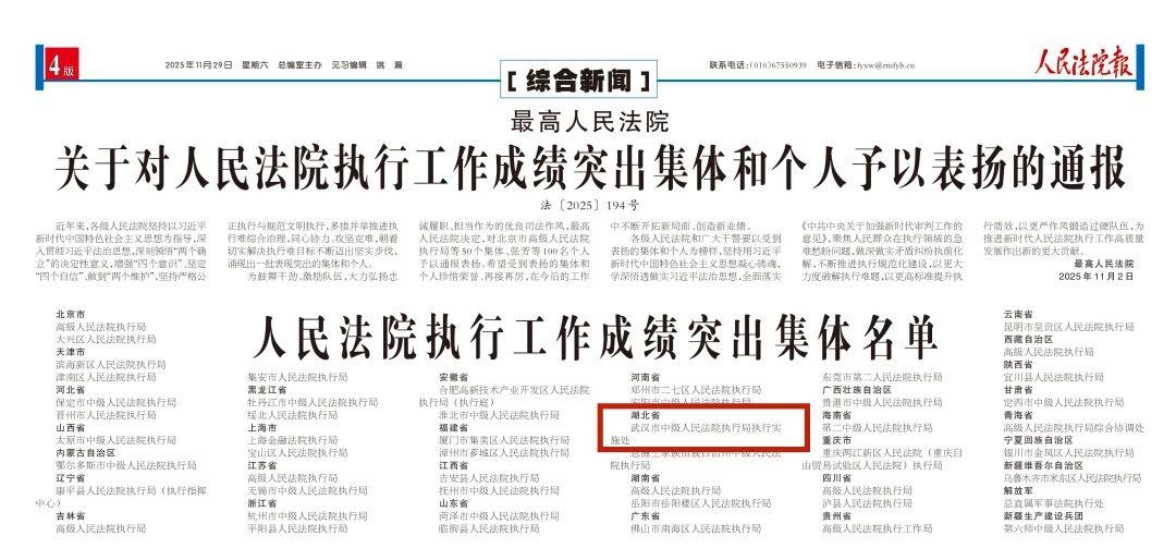 近日,最高人民法院印发《关于对人民法院执行工作成绩突出集体和个人予以表扬的通报》,对全国法院50个集体、100名个人予以通报表扬。其中,武汉市中级人民法院执行局执行实施处获评“人民法院执行工作成绩突出集体”。