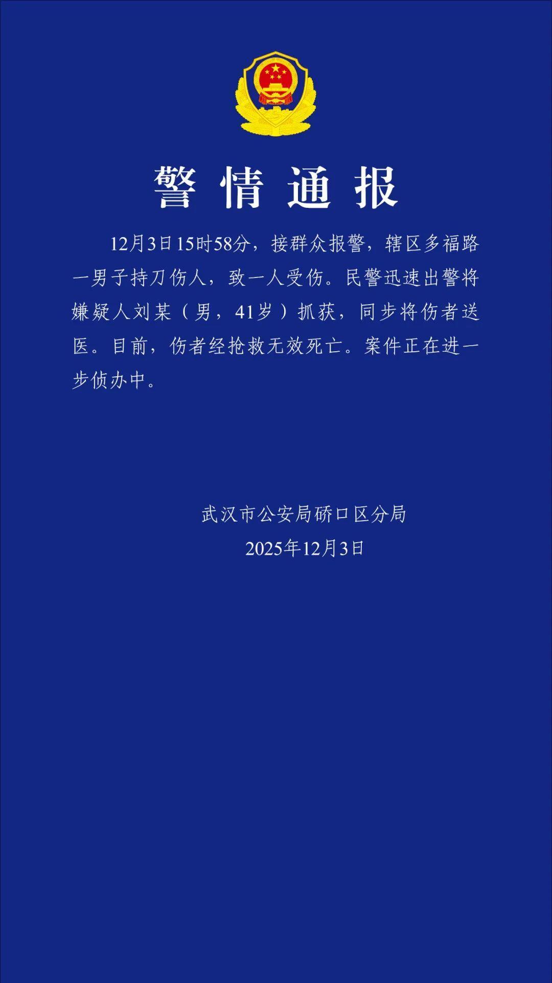12月3日15时58分,接群众报警,辖区多福路一男子持刀伤人,致一人受伤。民警迅速出警将嫌疑人刘某(男,41岁)抓获,同步将伤者送医。目前,伤者经抢救无效死亡。案件正在进一步侦办中。
