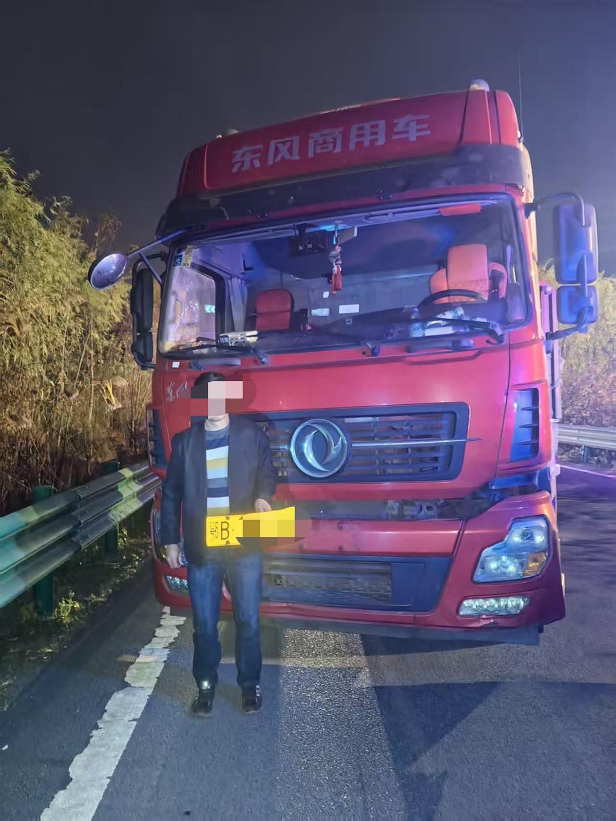 12月2日22时许,四中队民警宋卫华、辅警张齐志在夜间巡逻时接到协同单位紧急通报:一辆红色重型货车在挽月收费站因超限被拒后,驾驶员竟卸下车牌强行冲卡,已被前方布控的派出所民警成功截停。民警火速赶赴现场,发现涉事司机因担心被处罚而情绪激动。民警耐心倾听其诉求,细致宣讲相关法规并说明违法后果,最终让司机冷静配合调查,从驾驶室内取出藏匿的合法号牌鄂Bxxxxx。面对确凿事实,司机如实承认了为逃避检查卸牌冲卡的违法行为。