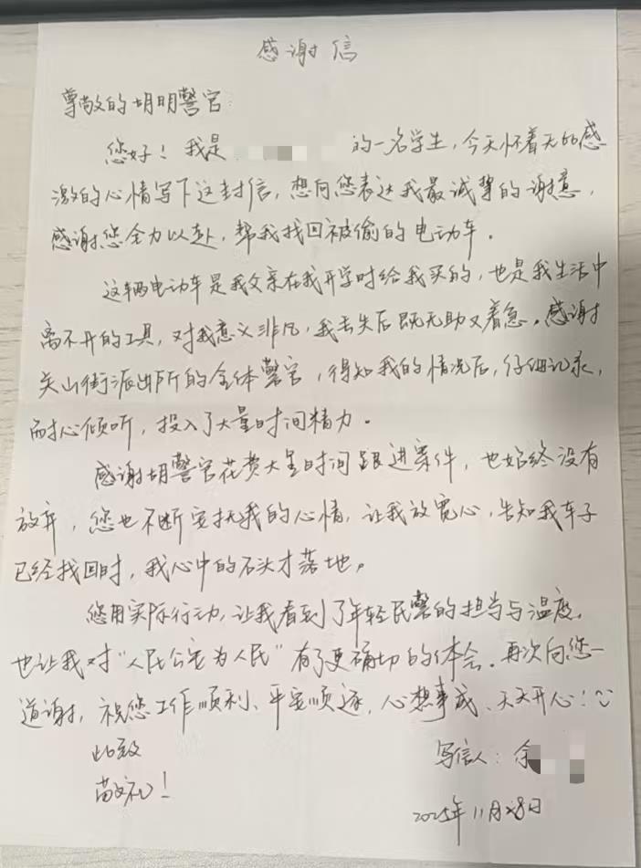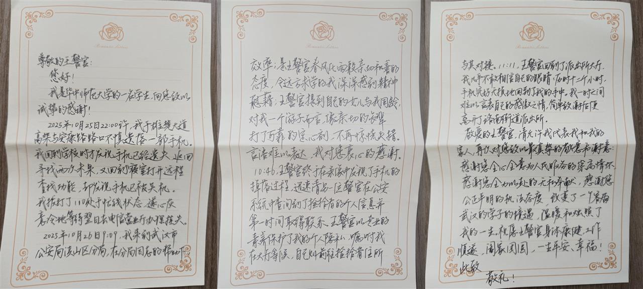 “民警同志们不顾疲劳,多方排查搜寻,经过数小时不懈努力,协助我们找到了我父亲。”12月1日,市民熊女士在感谢信中这样写道,话语中满是庆幸与感激。同一时间,辖区某大学金同学将锦旗和感谢信送至珞南街派出所,联峰时代广场的余女士在领回被盗电动车后也写下感谢留言。三封感谢信,串联起武汉洪山公安民警扎根一线、为民解忧的暖心故事,让寒冬的城市暖意融融。