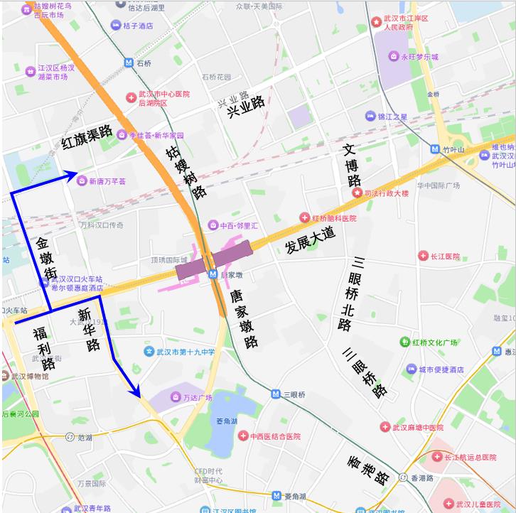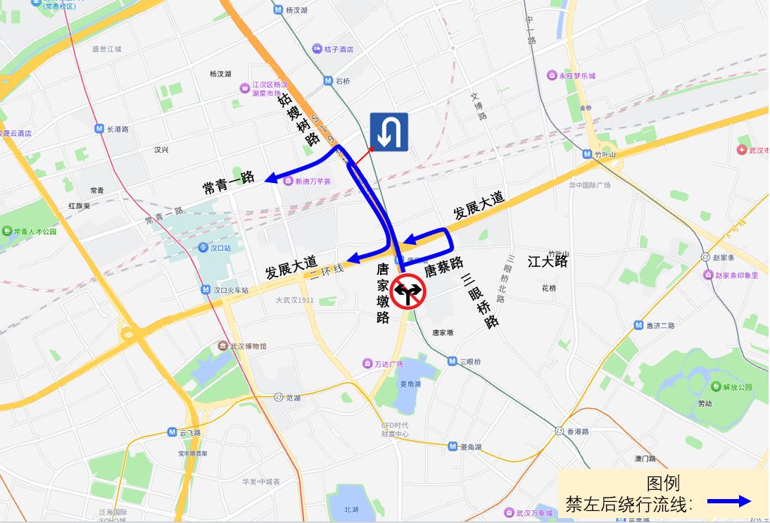 1.通过唐家墩路口南进口左转往汉口火车站方向的车辆,可在路口直行800米后掉头返回发展大道,或绕行常青一路;也可绕行唐蔡路、三眼桥路、发展大道。