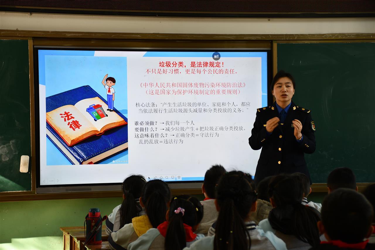 执法人员化身“普法老师”,走进武湖小学,为学生们带去一堂沉浸式垃圾分类互动课(见下图)。通过“道具归类竞赛”“分类知识抢答”等形式,在寓教于乐中普及垃圾分类的意义与做法,让环保意识和规则精神扎根童心。
