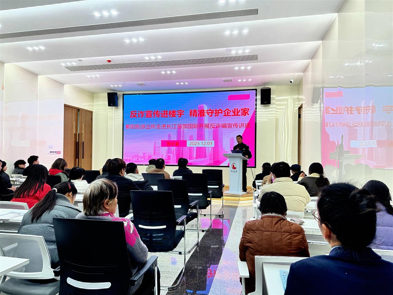 为切实增强辖区企业对电信网络诈骗的防范能力,守护企业财产安全,12月3日下午,武汉市武昌区公安分局紫阳街派出所副所长张小金带领社区警务团队成员,受邀走进长江总部国际写字楼,面向楼内各企业、单位的会计、财务及相关工作人员开展专项反诈宣传活动。