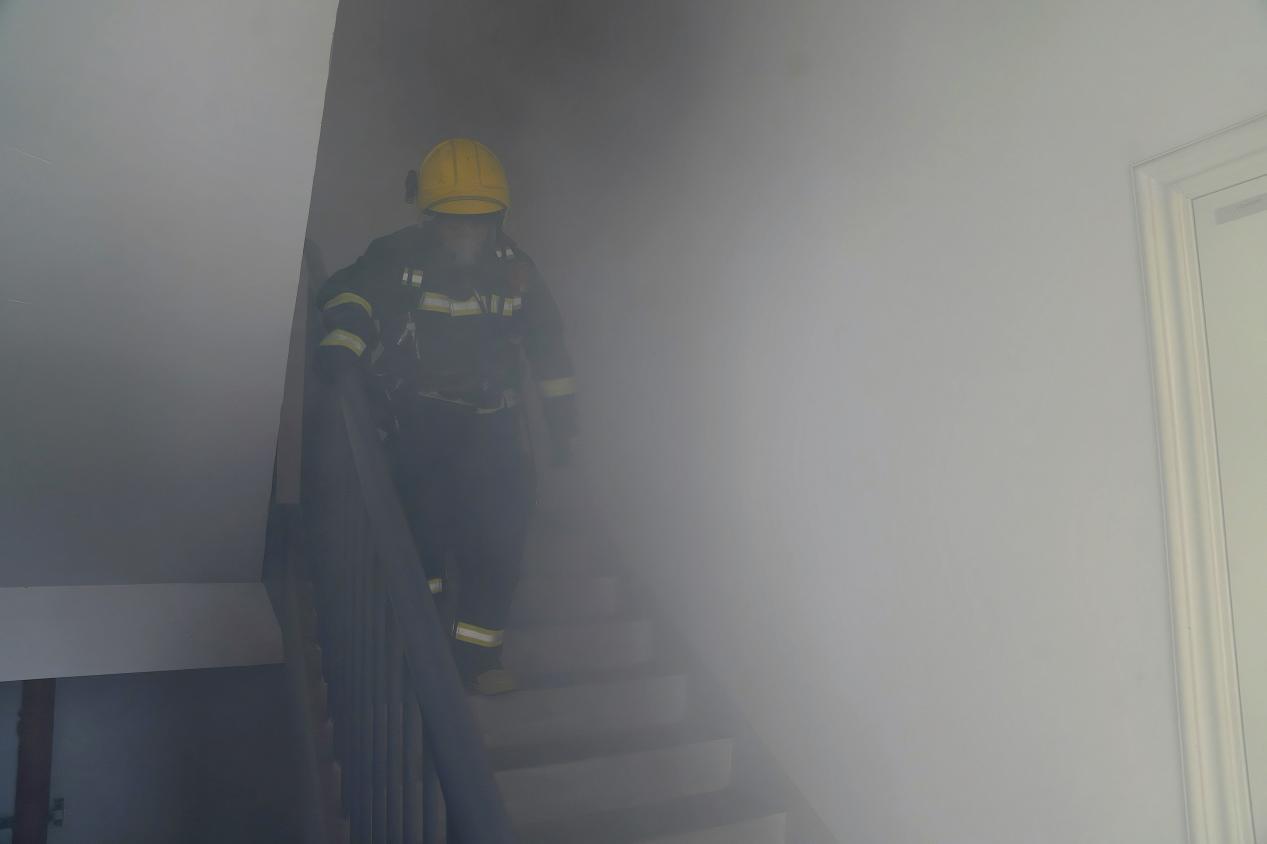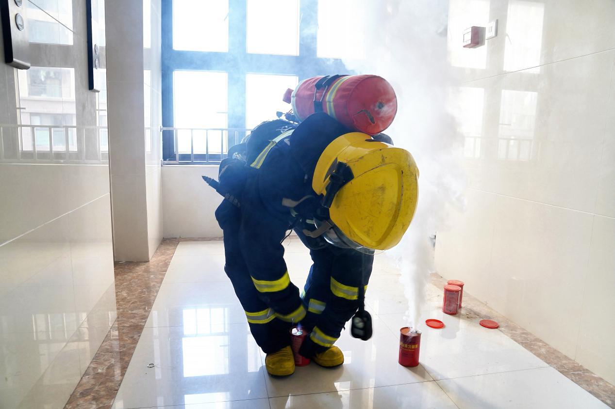 此次实验使用发烟罐模拟火灾初期烟气产生的场景,将发烟罐置于5层电梯前室,消防员启动发烟罐后,烟气迅速充满整个电梯前室,在5层常闭式防火门处于关闭状态时,有极少量烟气轻微渗入疏散楼道内,且浓度随着扩散而快速降低,疏散楼道内能见度保持在5米以上,未对疏散环境造成实质性影响。现场消防人员与小区业主代表模拟逃生人员在发烟罐启动5分钟后从7层沿疏散楼梯向1层撤离时,全程未受到浓烟干扰,逃生路线清晰可辨,被困人员可以安全通过这条“生命通道”疏散。