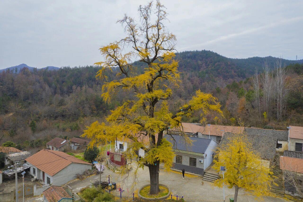 黄陂的初冬藏着怎样的惊喜?在武汉市黄陂区长轩岭街道竹园村李家山湾,树龄约830年的一级古树古银杏,迎来最佳观赏期,满树金甲醉初冬。