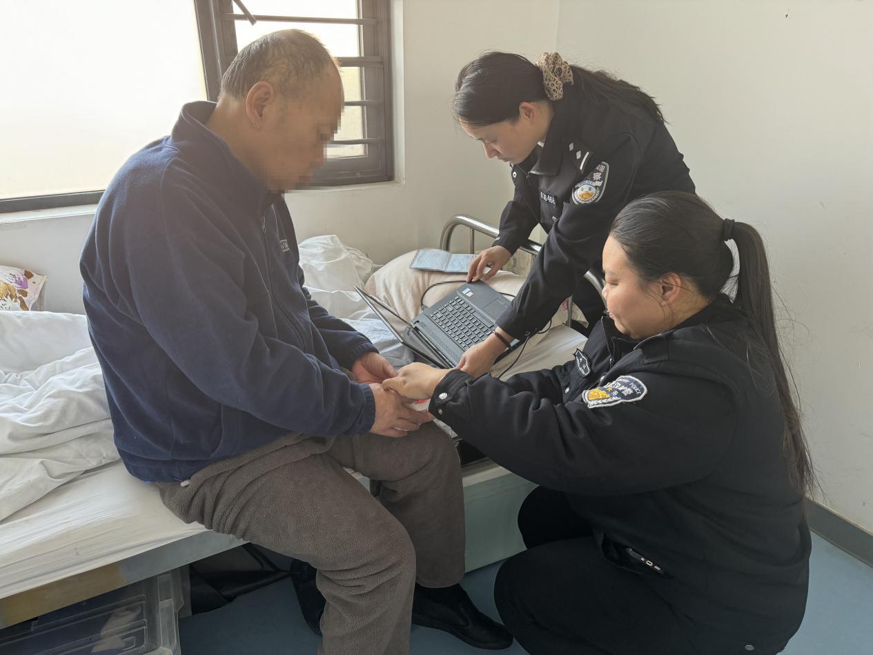 随后,民警携带办证设备,带领辅警方婷,赶到了求助人吴先生所在的医院内。办理现场,面对求助人情绪紧张、配合度低等情况,民警始终温和引导,逐步帮助其放松情绪、配合程序,最终顺利完成了制证信息的采集工作,成功为求助人申办了新的居民身份证件。