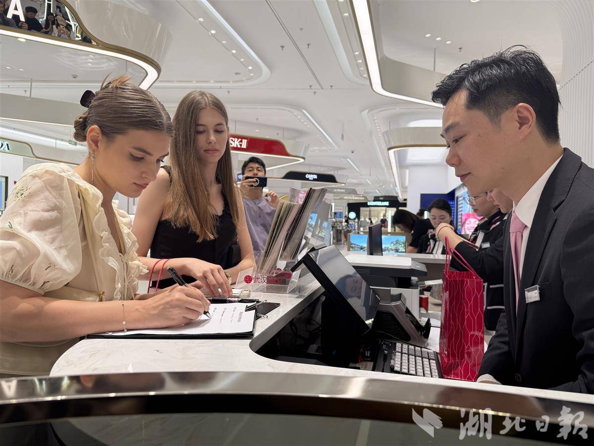 2025年7月1日11时,在武汉SKP百货办理完离境退税手续后,俄罗斯姑娘Kseniia很是兴奋。当天,湖北离境退税政策启动,符合条件的境外旅客在指定商店购物时可享受免税待遇。