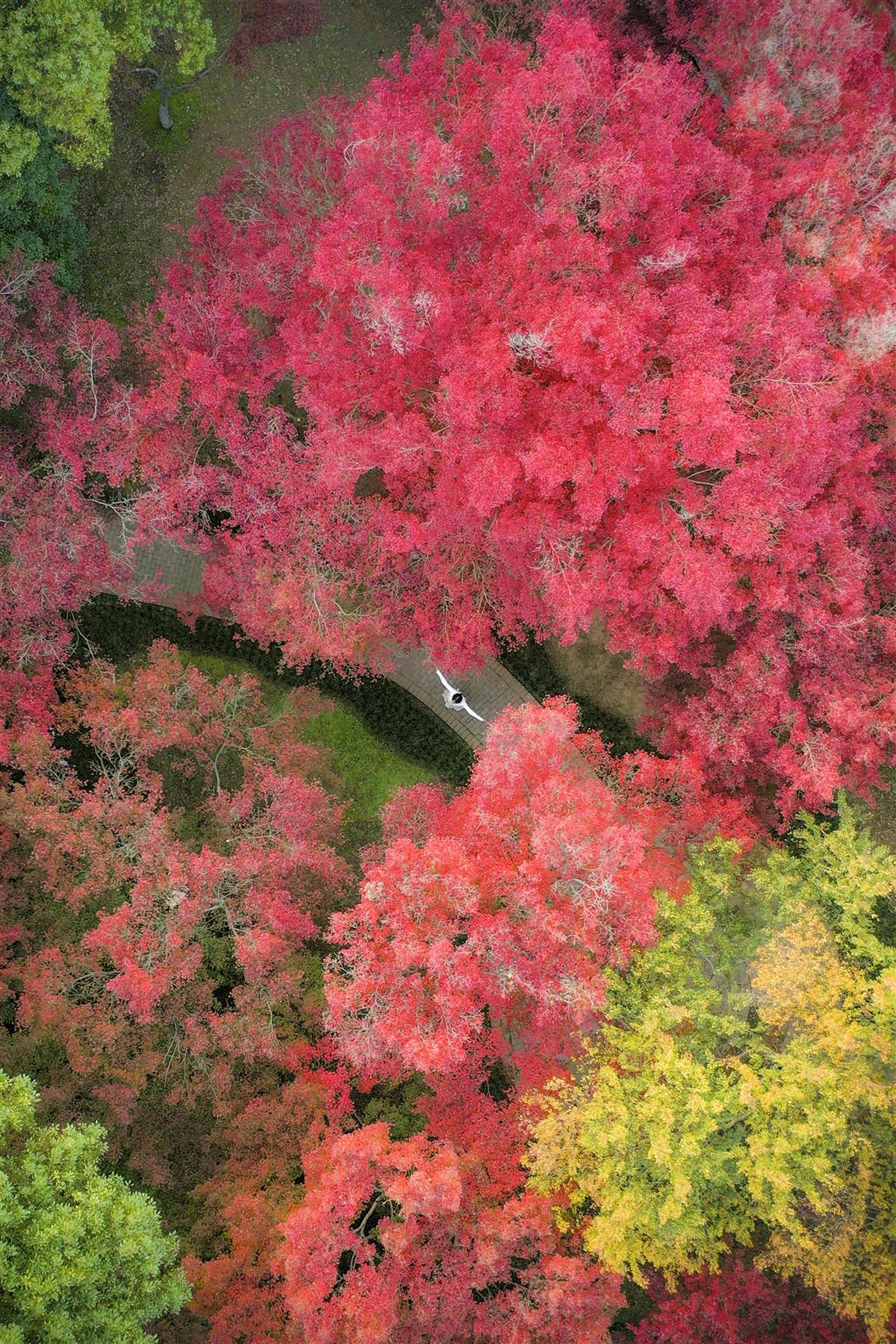 “停车坐爱枫林晚,霜叶红于二月花。”12月9日,走进京广高铁旁边的武汉市青山公园,百余株红枫次第浸染,枫叶与碧波粼粼的丽湖、挺拔参天的水杉相互映衬,仿若一幅浓墨重彩的油画(见下图)。