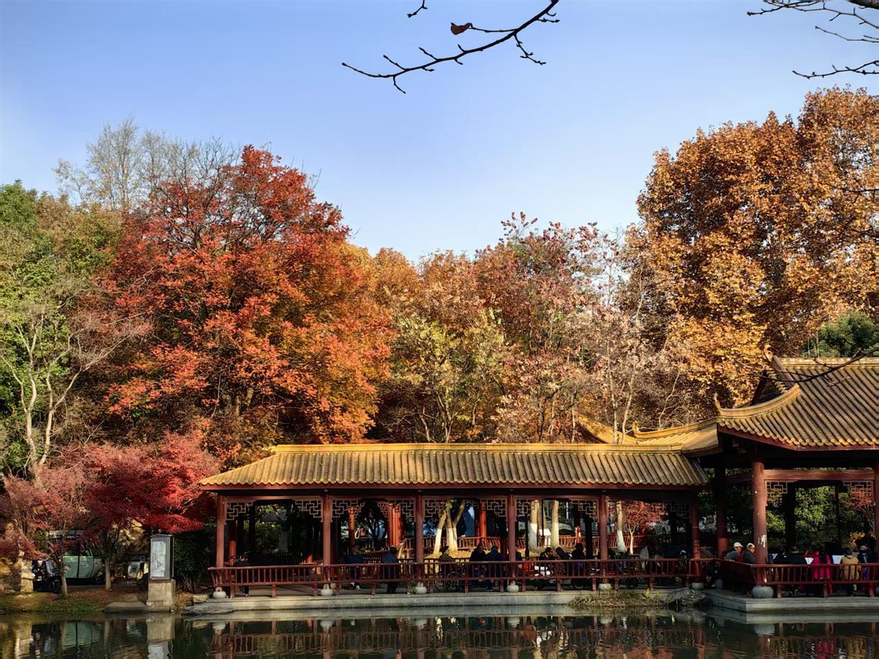 青山公园工作人员介绍,园内现有红枫类树木110余株,其中,最负盛名的当数丽湖畔的“霜天红叶”。这里矗立着树龄超过40年的鸡爪槭十余株,它们的叶片已尽数转为炽烈深红,倒映在湖面,如梦似幻,是市民朋友们必到的“打卡点”。