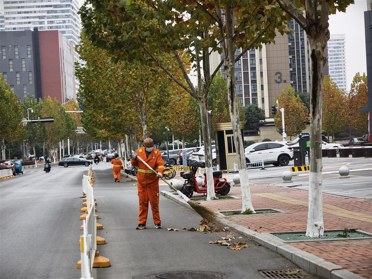 宏图一路旁,几名环卫工人正协作将装满落叶的编织袋搬上运输车,汗水浸湿的工装紧贴后背,却挡不住默契的笑意。他们身后,原本堆积的落叶已不见踪影,只剩零星几片梧桐叶随风轻摇,为秋日增添了几分灵动与清爽。
