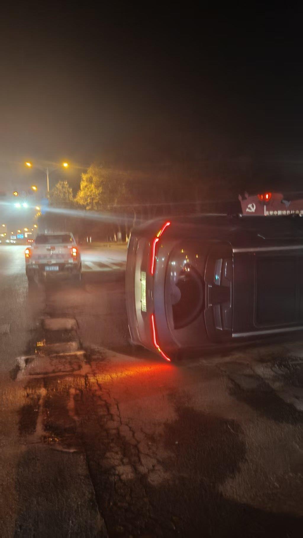 12月8日晚11时许,蔡甸城管中法生态城执法中队队员汪作文、苏鹏飞、夏雪等3名队员夜间巡逻至中核十字路口时,一阵急促的呼救声打破了夜的宁静。循声望去,只见一辆电动轿车已侧翻在道路中央,车身呈90度倾斜,右侧车门完全贴地,左侧车门朝上悬空,车内人员被困,一时无法脱身。