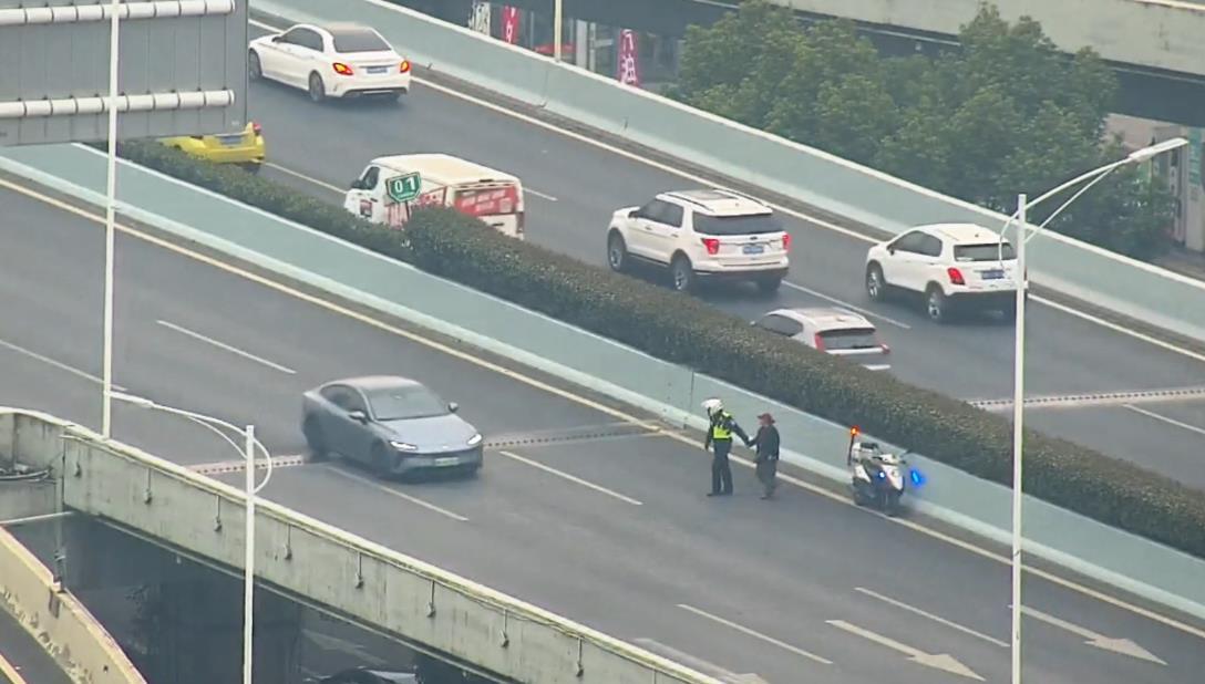 “老人家,您怎么走到这上面来了?太危险了,先靠边站。”何政一边引导老人向相对安全的区域移动,一边耐心询问情况。考虑到警车上未配备安全头盔,用警用摩托车载其下高架存在风险,何政决定先陪同老人移至路边,再设法寻求协助。