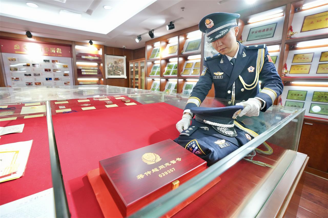 分局政委李国祥对警号和警服进行仔细整理,随后将装有“039357”警号的礼盒盖好。