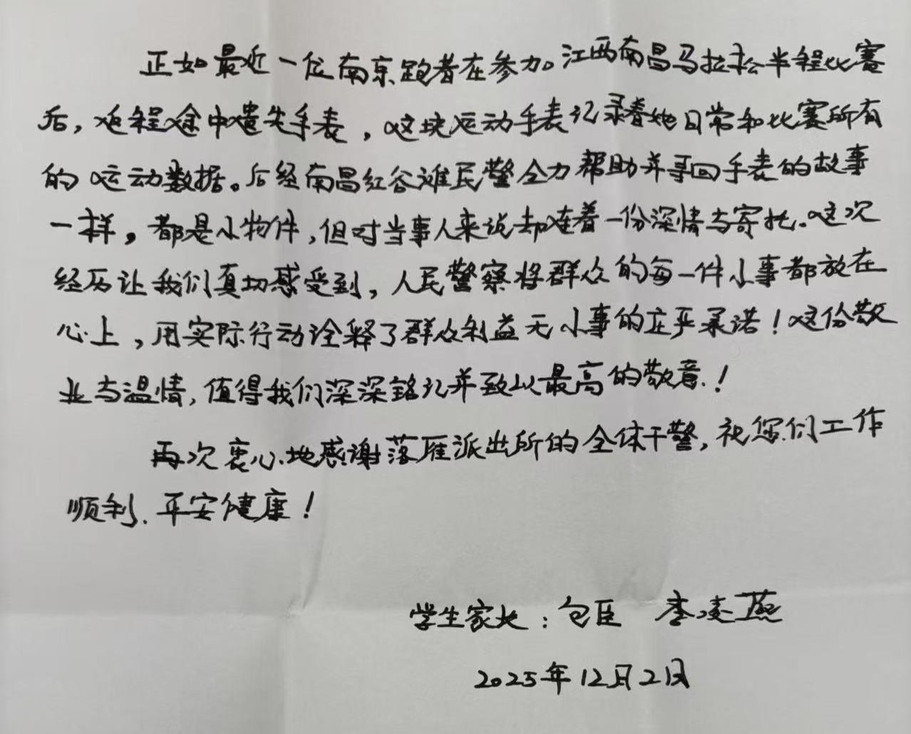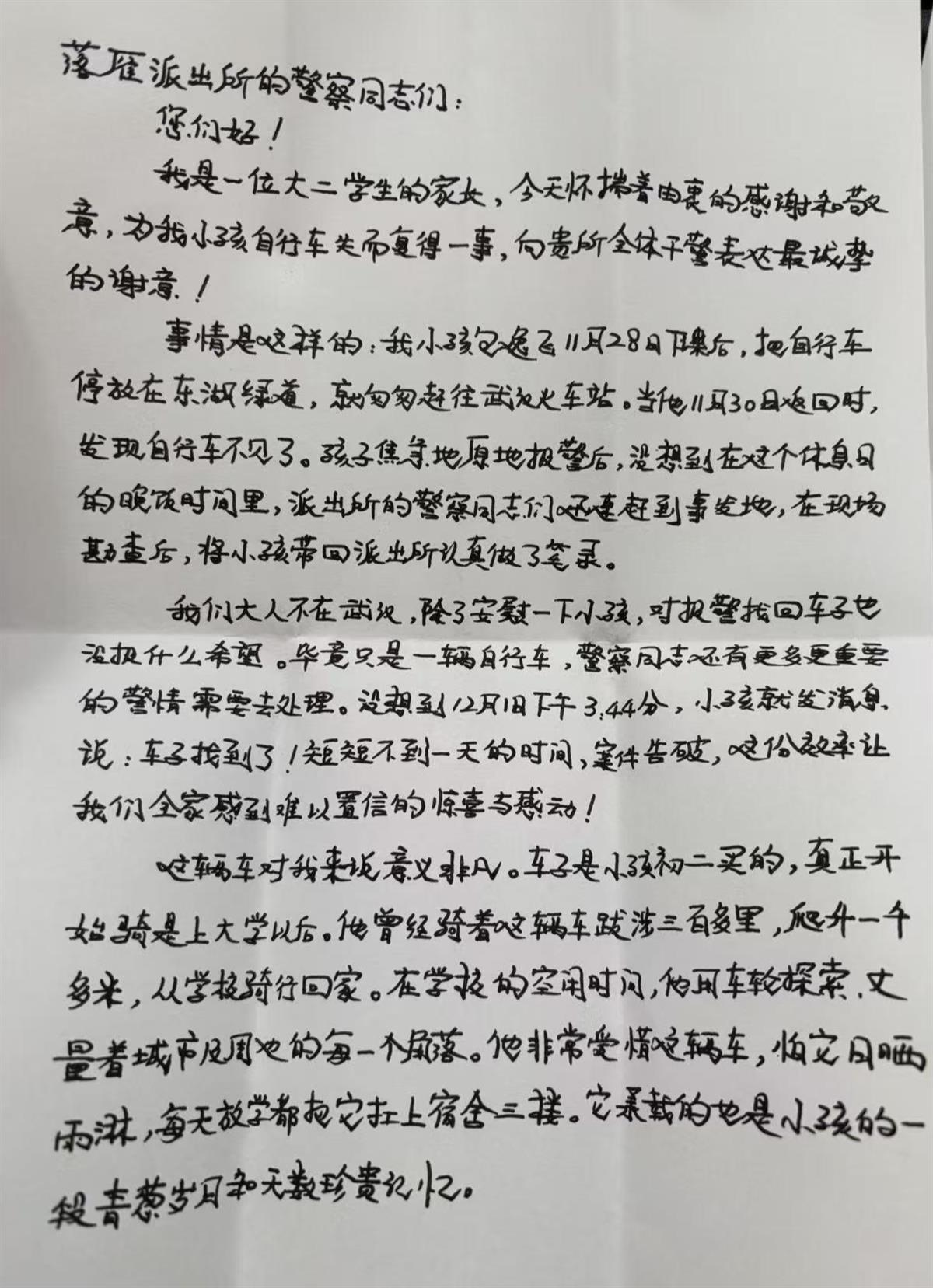 “报案时没抱太大希望,没想到不到一天时间车就找回来了。”12月11日,武汉市东湖生态旅游风景区公安分局落雁派出所民警收到一封手写的感谢信。写信人是武汉城市学院学生包同学的家长,字里行间饱含深情,对民警快速破案、挽回损失连连点赞。
