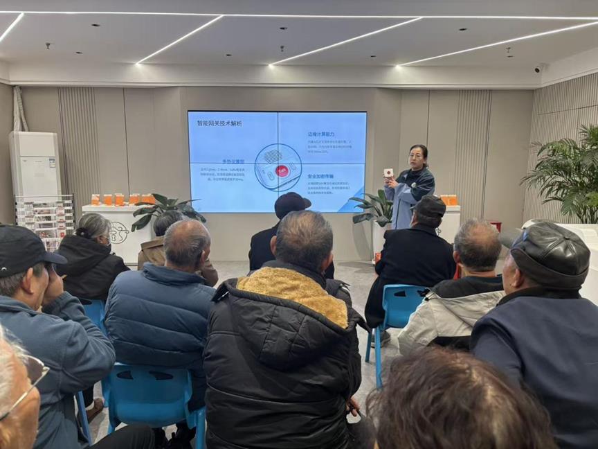 宣讲结束后,社区人工智能养老试点工作人员围绕居家安全痛点,重点展示门磁、红外感应器、智能手环及智能网关等设备。其中,具备心率监测、一键呼救和精准定位功能的智能手环,可应对独居老人跌倒、忘关火等风险;门磁与红外感应器能感知门窗开关及屋内活动,联动网关可向子女推送异常警报,且子女可远程协助管理,保障设备“好用、易用”。