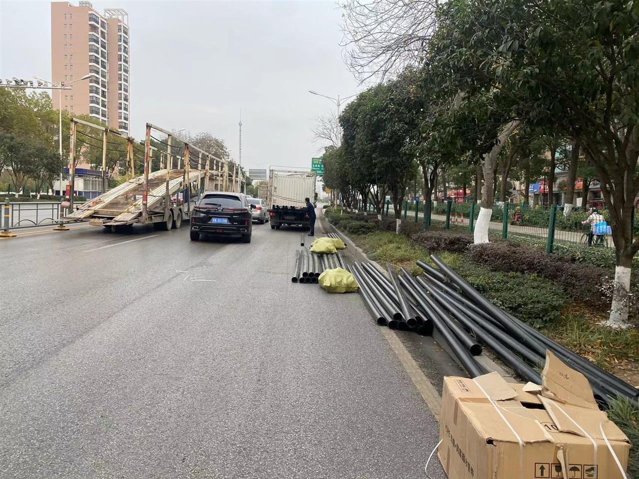 12月12日15时15分左右,在蔡甸区新天大道的一处红绿灯前,蔡甸区城管中法生态城执法中队队员龚航和余凯正驾车赶赴“百日攻坚”任务现场。绿灯亮起的瞬间,前方一辆货车上倾泻而下的数十根PE管。路面瞬间一片狼藉。几大袋弯管和一整箱金属扣件也散落一地。这些物品相互混杂,绵延十余米,阻碍了道路通行。