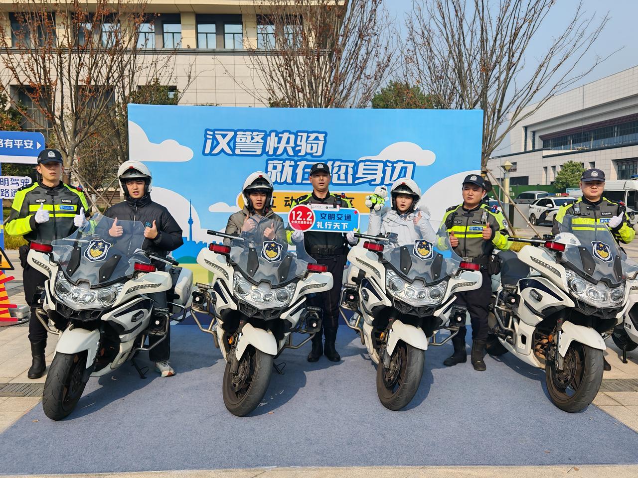 汉警快骑互动拍照区里,四辆酷炫的警用摩托车成为“网红打卡点”,背景板上“汉警快骑就在您身边”的标语格外醒目。在民警的指导下,同学们不仅能近距离观摩警用装备,还能亲身体验试乘摩托车,大家争相与汉警快骑队员合影留念。