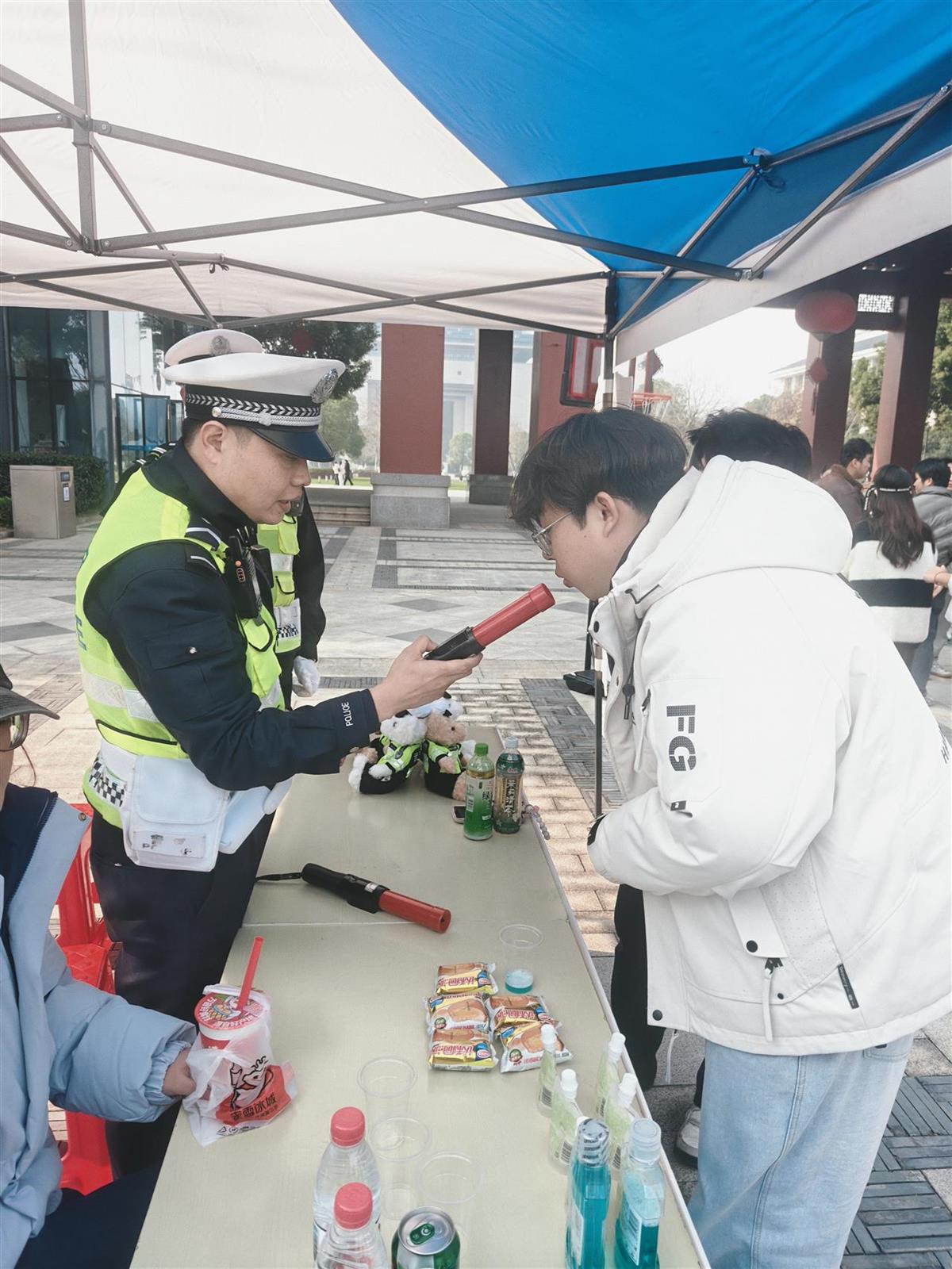 酒醉驾体验区,民警准备了蛋黄派、漱口水、米酒、听装啤酒等含酒精类物品,还有专业查酒驾设备和酒醉驾体验眼镜供师生体验。当有同学仅仅含了一小口漱口水时,酒精测试仪便发出了报警声,在场的同学们纷纷发出了惊叹。