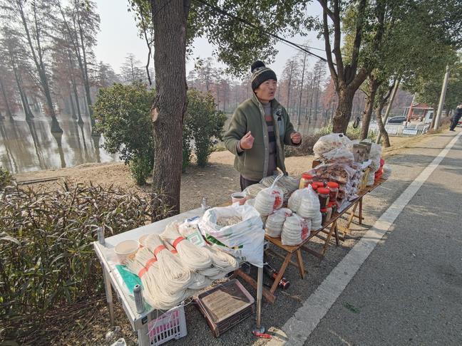 “来来来,品尝一下涨渡湖里的野藕,粉糯香甜。”“我们自己摊的豆丝、打的糍粑还有油面,原汁原味。”道路边,小贩的吆喝声此起彼伏。他们均在涨渡湖街道综合执法中心指定的范围内,有序摆摊售卖农副产品(见下图),吸引了不少游客购买。