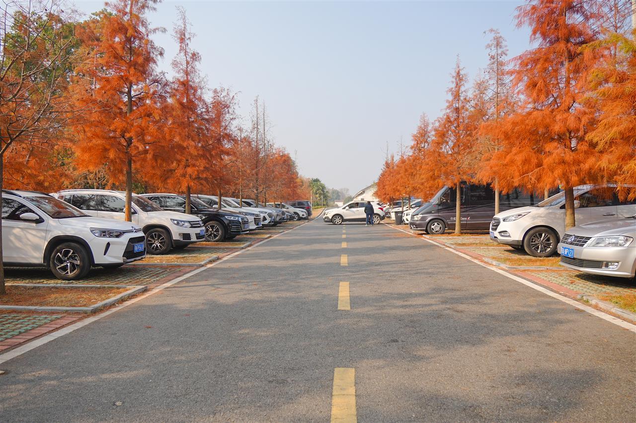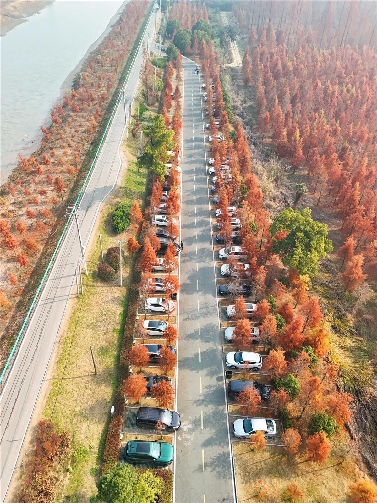 当天上午11时许,记者沿着湿地堤路前行,接近水上池杉林时,只见旱地池杉间,铺上了织草砖,一个可同时停放84台车辆的生态停车场映入眼帘(见下图)。两排火红的池杉像“迎宾”一样,迎接来自四面八方的游客。