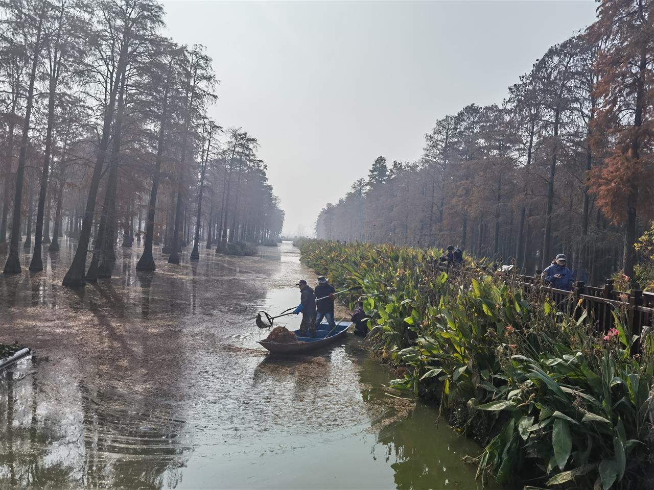 眼下,正是池杉落叶、鸟儿落毛之时,湖面漂浮着一层“污渍”,3位清漂人员划着小船,穿着下水衣,打捞湖面漂浮物(见下图)。“我们不能让落叶破坏了水质,更不能让落叶、垃圾破坏水上池杉林的美景。”清漂人员徐金芝告诉记者,落叶不停,打捞不止。岸边不少游客摁下快门,将徐金芝们的劳作定格在风景中。