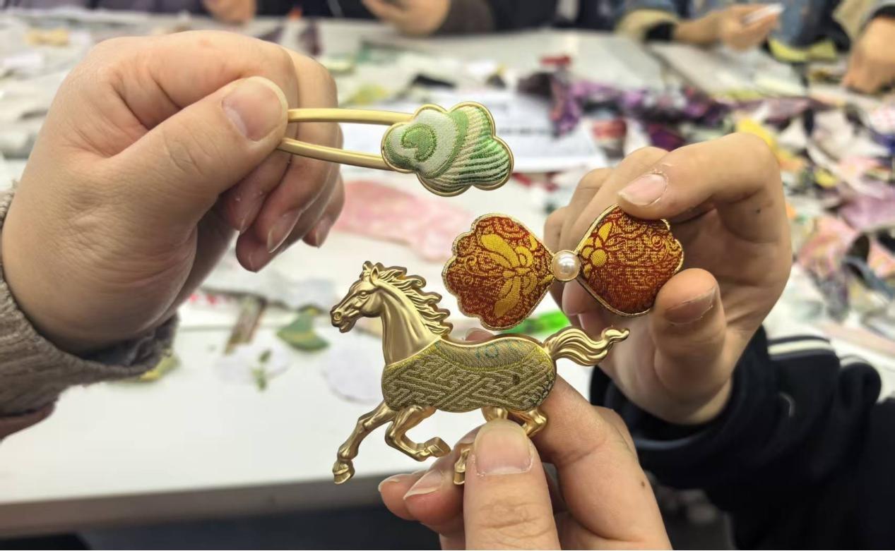 活动现场,各色纹样典雅、质地细腻的宋锦面料吸引了众多女性及亲子家庭的目光。因对传统手工艺的共同兴趣爱好,起初陌生的参与者迅速熟络起来。她们挑选心仪的纹样,灵活运用留白、对称等美学手法,或大胆随性剪裁组合,将一片片古风织物,转化为一件件独具巧思的个性化文创作品。