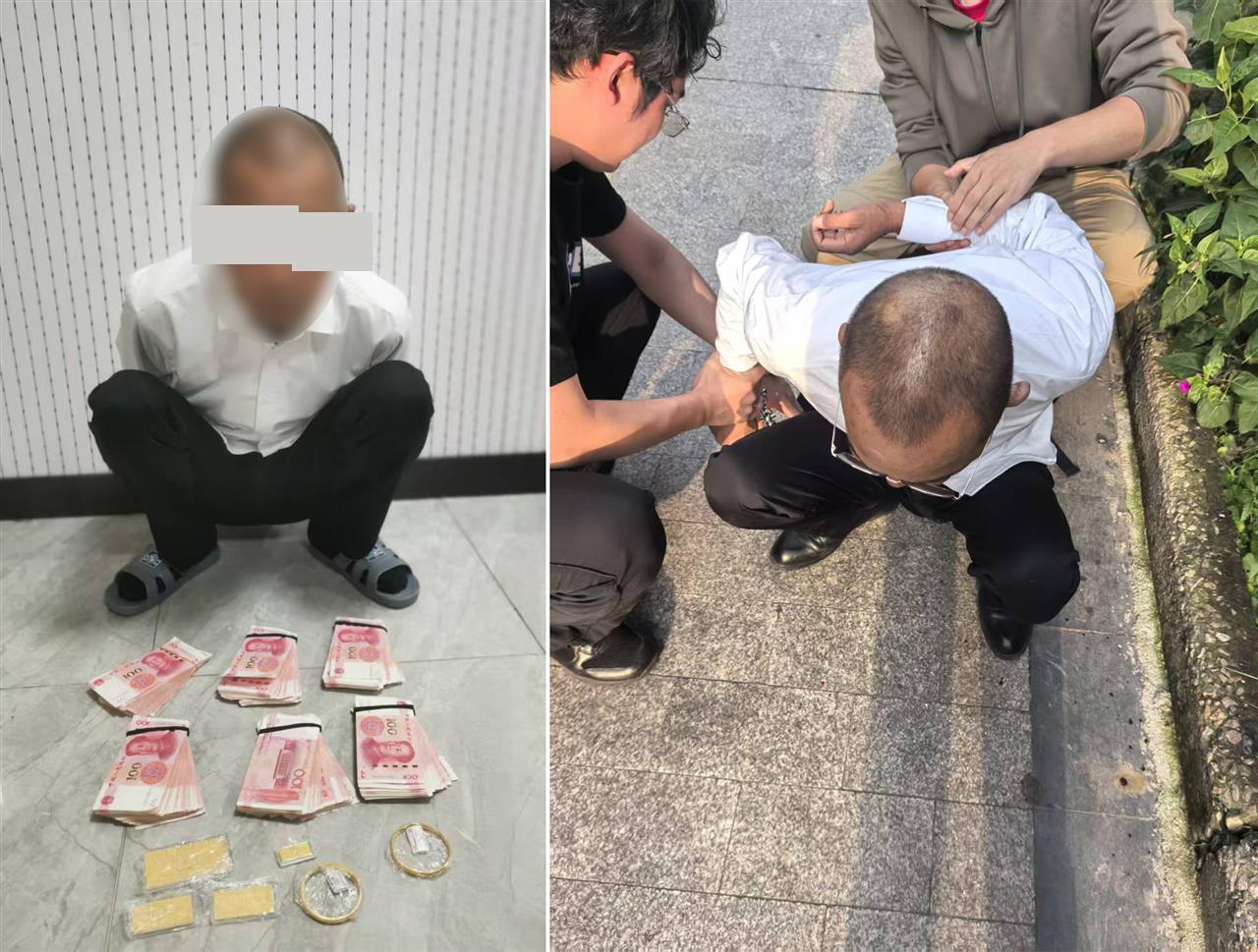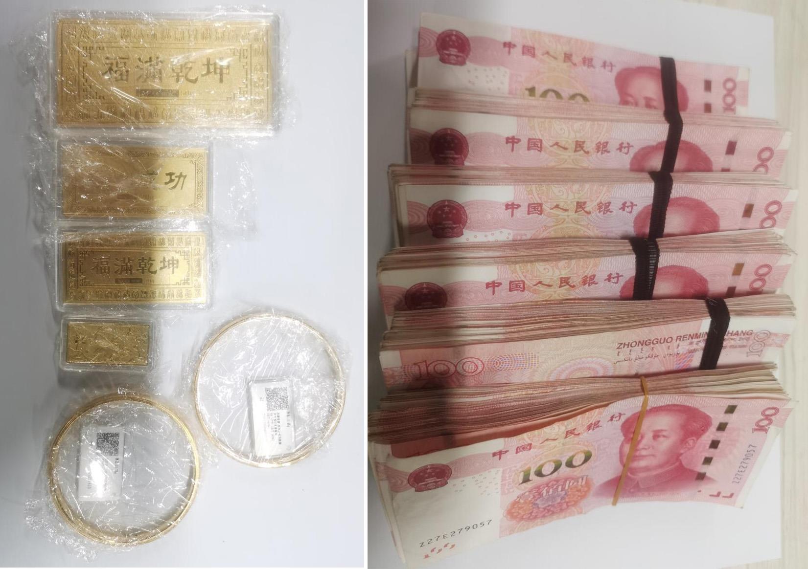 紧急关头,埋伏在周边的民警,一个箭步冲上前,飞身将该男子扑倒。民警摔在水泥地上,手背多处挫伤,仍紧抓该男子不放,牢牢将其控制在身下。当场拦截了5.7万元现金和124克黄金。