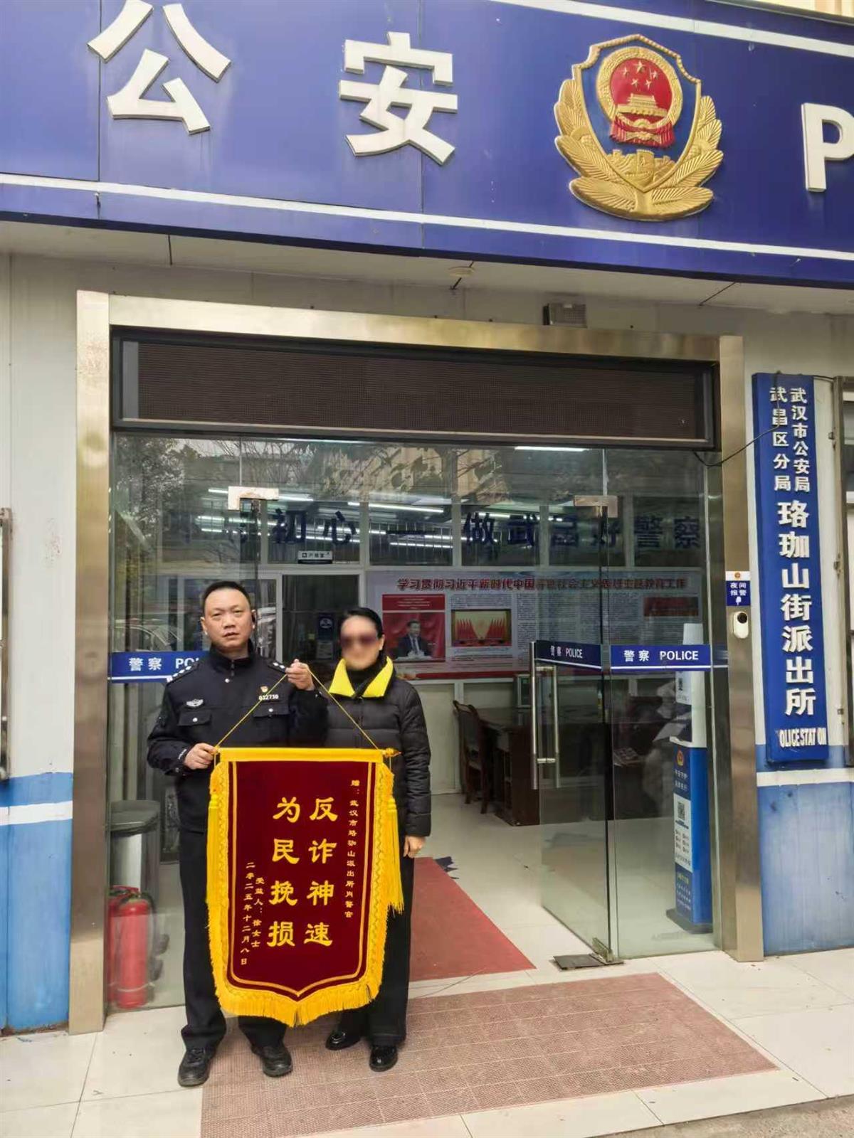 12月16日,徐女士专程来到珞珈山街派出所,将一面印有“反诈神速 为民挽损”的锦旗送到民警冯涛手中,表达由衷的感激之情。