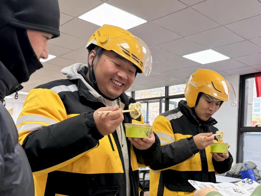 活动现场最具人气的当数一碗碗热气腾腾的手工水饺,商户醉得意虎泉店特意为奔忙的新就业群体准备了现包现煮的手工水饺。一盘盘热气腾腾的饺子被端上桌,皮薄馅大、鲜香四溢,大家围拢分享。“饺子真暖,身上热乎,心里更暖!”快递小哥一边吃着,一边笑着展示刚领到的专属优惠券。现场笑语不断,温情流动,每一口饺子都传递着寒冬中的真挚祝福。