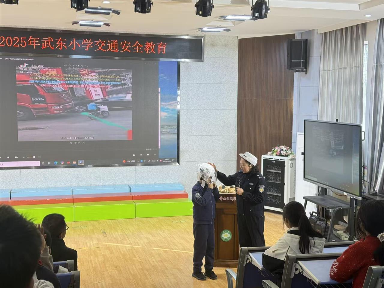 12月19日15时许,武汉市青山区武东小学五年级教室内,一堂由武汉市公安局青山区分局交通管理大队十中队民警带来的交通安全课正在进行。当民警展示“大货车瞬间撞飞闯红灯电动车”的监控画面时,全场响起一片惊呼。