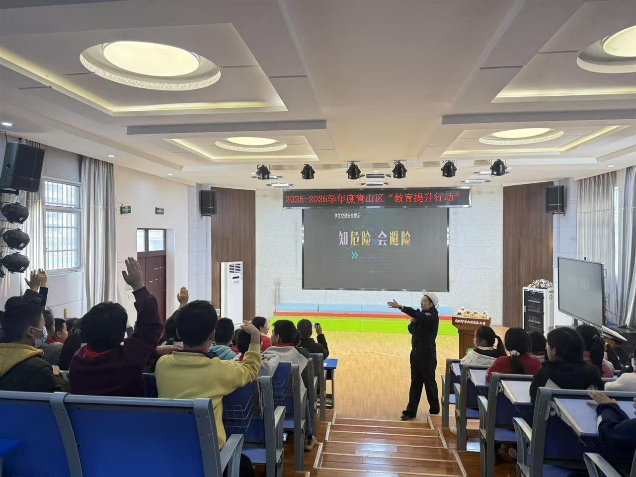当日,青山区交通管理大队十中队民警走进青山区武东小学,为五年级学生带来一堂生动的交通安全课。活动中,民警结合学生步行上学、乘车出行等常见场景,重点讲解三项安全守则:过马路须遵守“一停二看三通过”原则、乘车须全程系好安全带、骑行电动车正确佩戴安全头盔,远离大型车辆视觉盲区。真实交通事故视频案例的展示,让学生们直观认识到交通违法行为的严重后果。